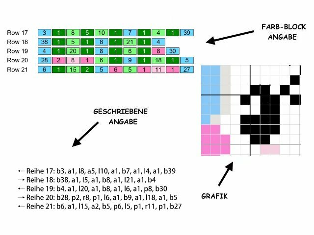 -farbige Zahlen-Blöcke für jede Reihe für feste Maschen (Stb od. hStb)