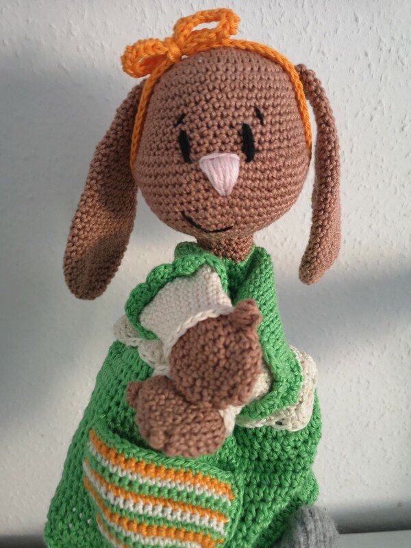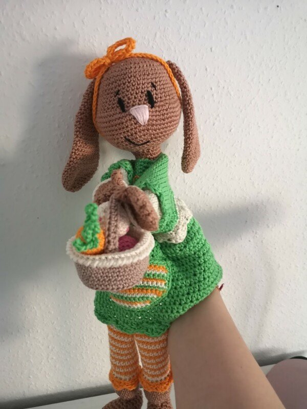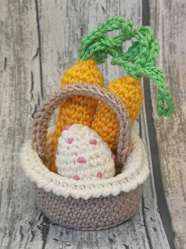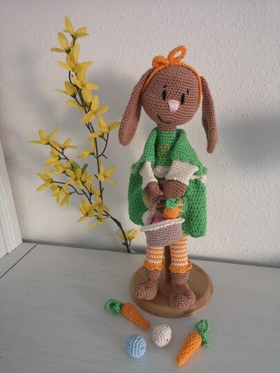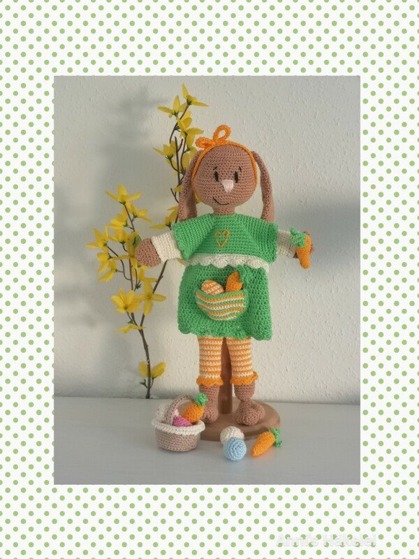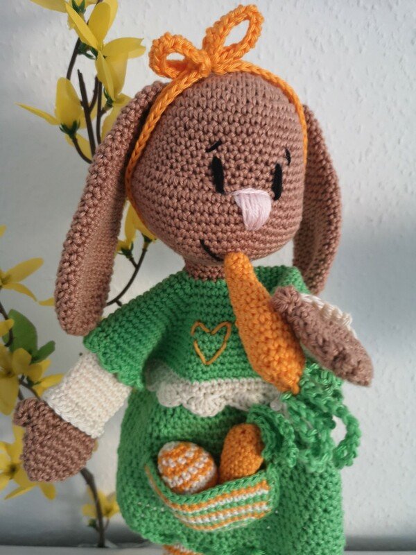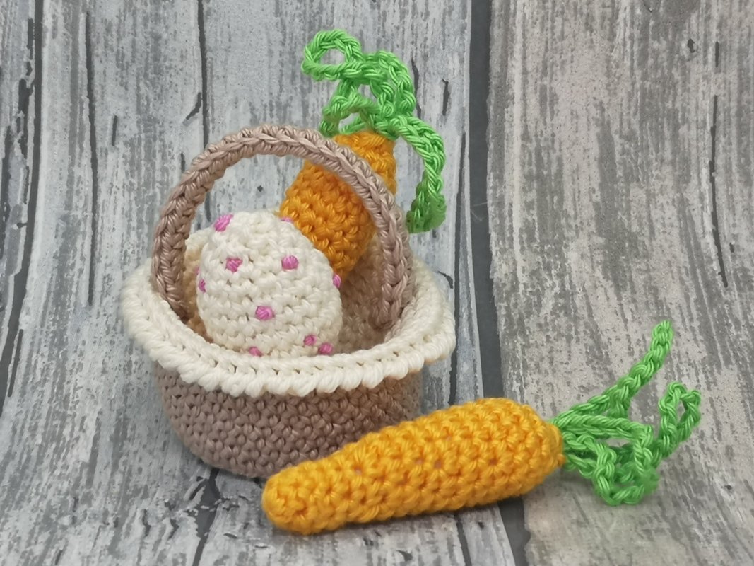 In der Anleitung wird erklärt wie ihr euch Mimi Meyer,das Körbchen sowie die Möhren und die Eier häkelt.