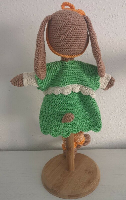Bei dem vorgeschlagenen Garn und Häkelnadel 2,5 bzw. 3,0 wird Fräulein Mimi Meyer ca. 35 cm groß.