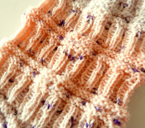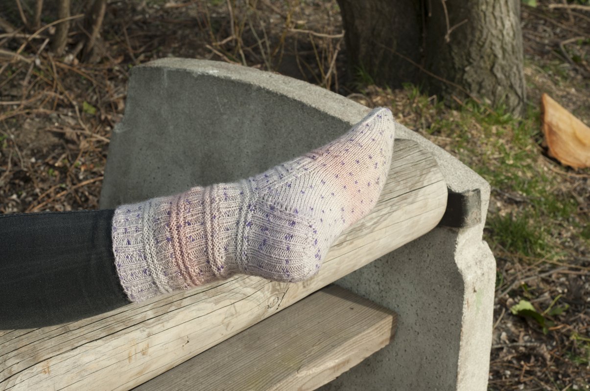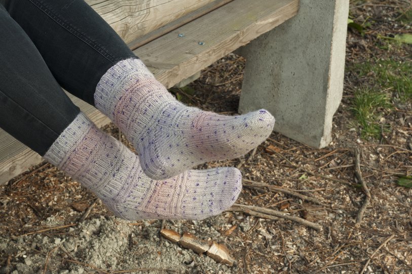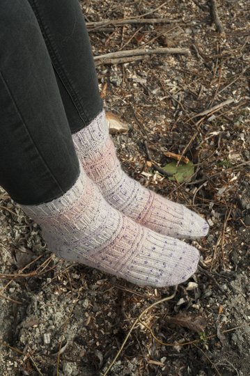The socks are worked top-cuff-down in an easy textured stitch pattern, using fingering weight yarn. The pattern is written for the use of DPNs.
