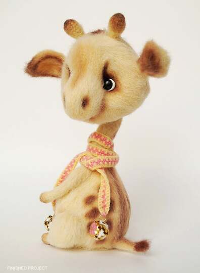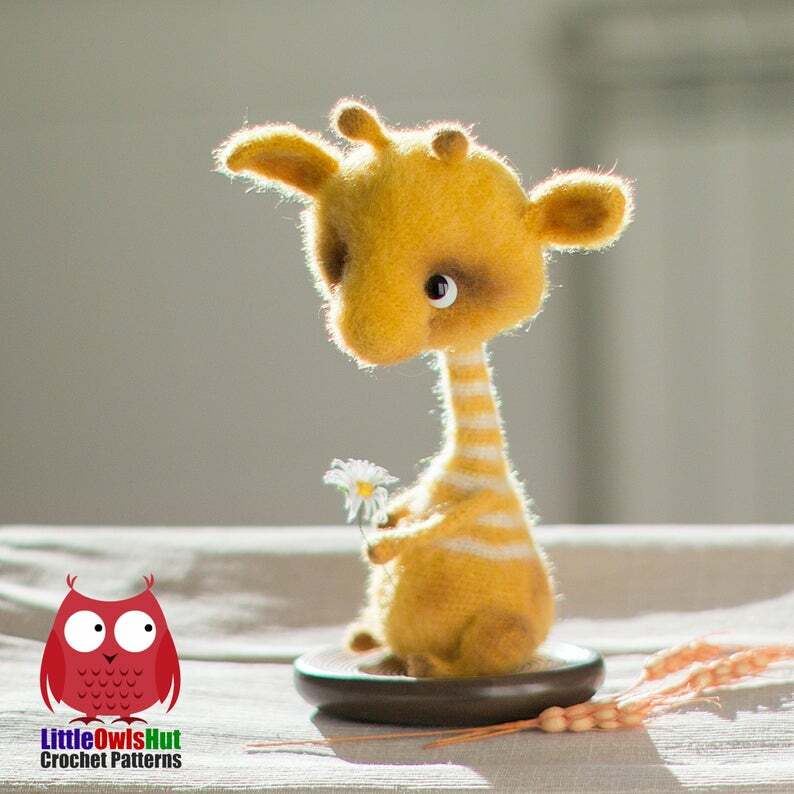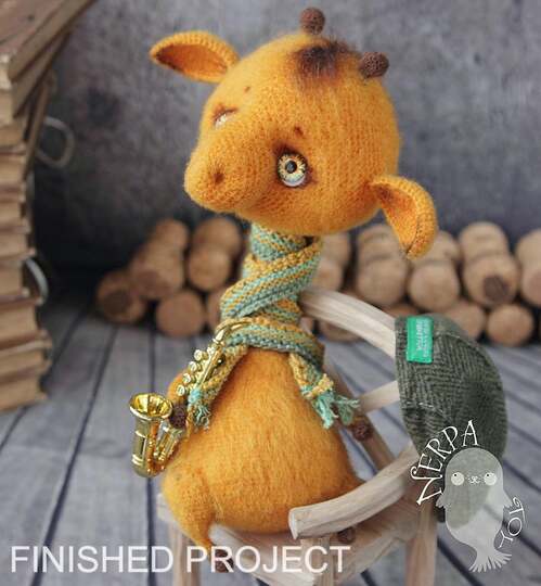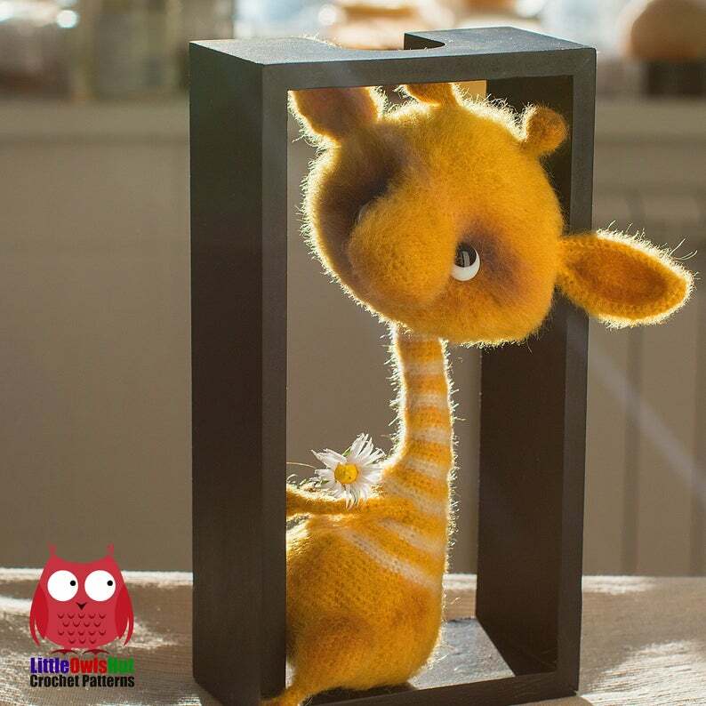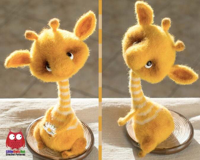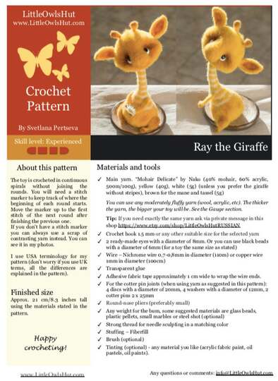Main yarn. “Mohair Delicate” by Nako (40% mohair, 60% acrylic, 500m/100g), yellow (40g), white (5g) (unless you prefer the giraffe without stripes), brown for the mane and tassel (5g)