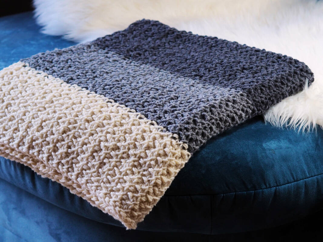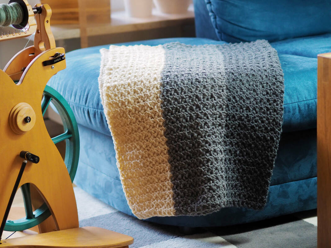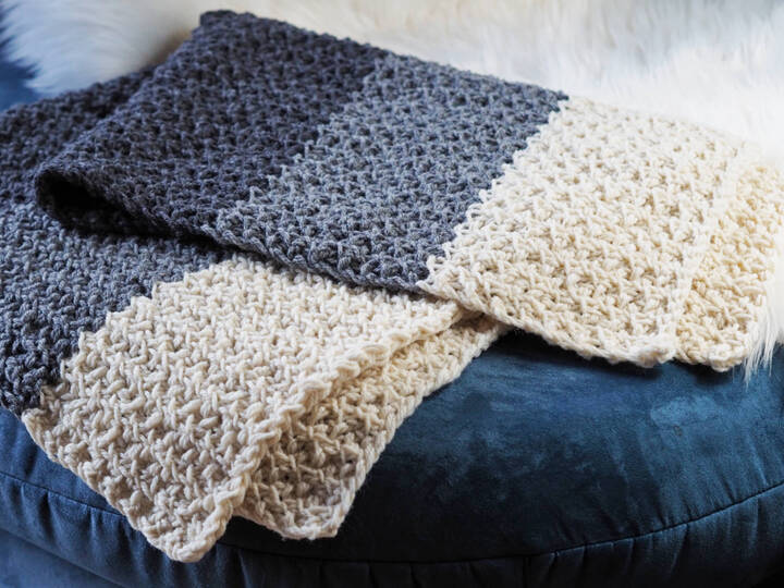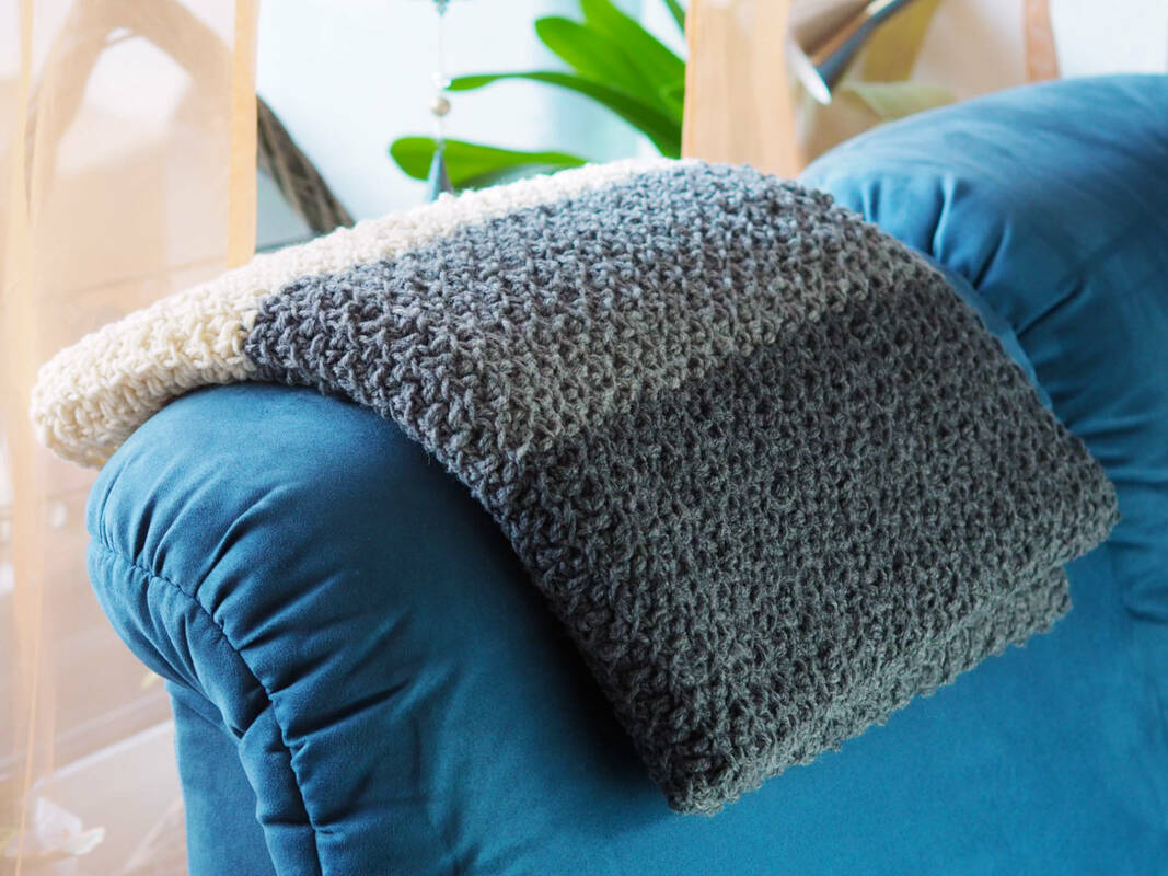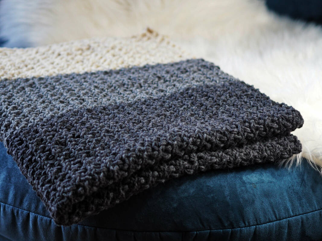 Seit einigen Jahren faszinieren mich einfarbige Muster, die dank doppelter Fadenführung gestrickt werden. Aus einfachen linken und rechten Maschen können so völlig neue Strukturen entstehen. Besonders erfreulich daran ist, dass die gestrickten Flächen von beiden Seiten toll aussehen und die Projekte dank des Doppelfadens und der großen Nadelstärke sehr schnell fertig sind. So kannst du diese Decke im kleinen Format locker an einem Wochenende stricken.