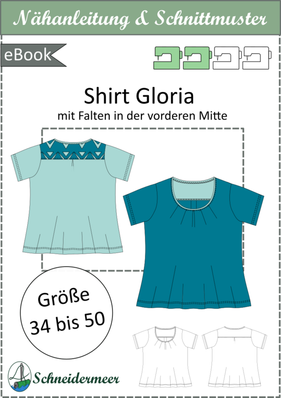 The "Gloria" sewing pattern features a comfortable-fit jersey shirt with asymmetrical pleats at the neckline of the front piece. The back piece is designed with a yoke and a decorative inverted pleat. The pattern includes sleeves in 4 different lengths.