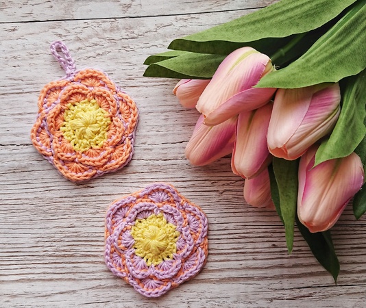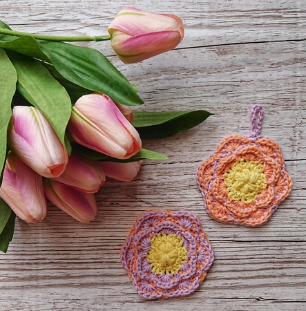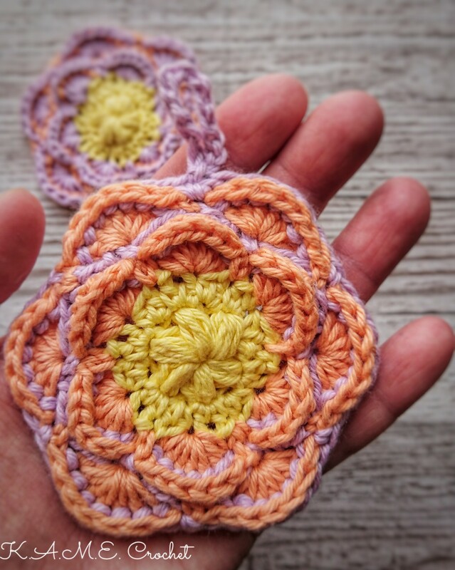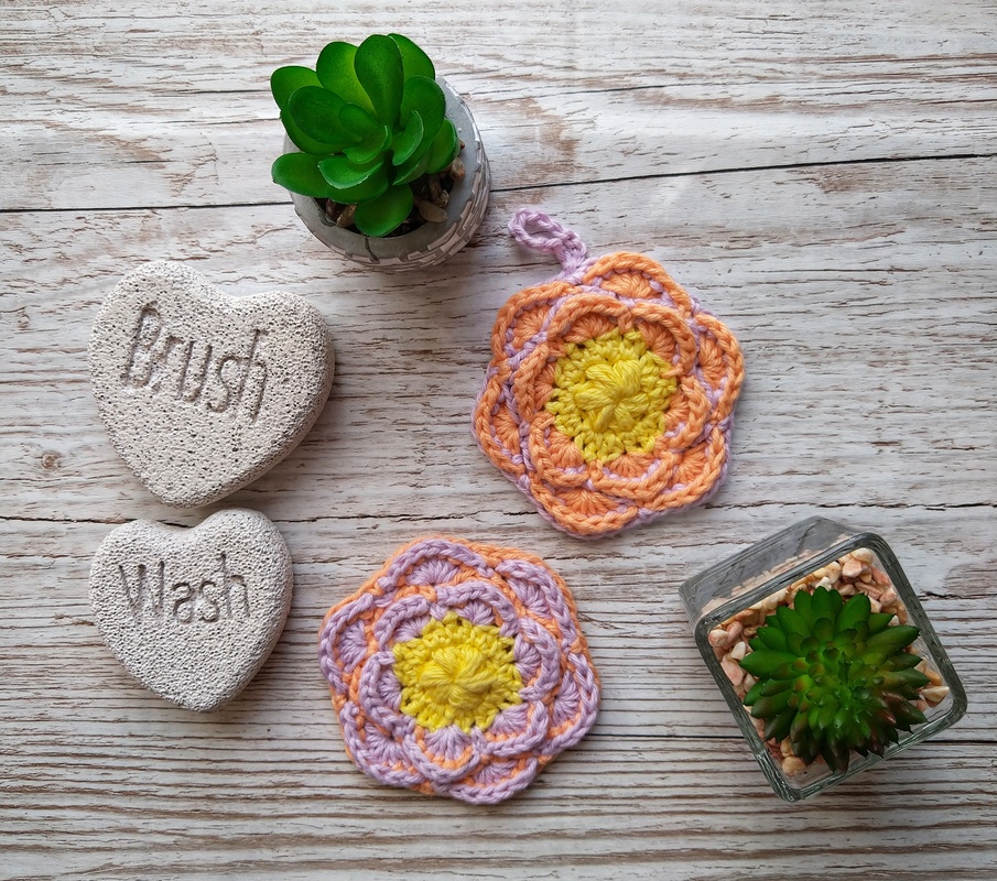 This beautiful face scrubbie pattern is working up quickly and reminds me of Spring, flowers, sunshine and the colors which I have missed a lot during winter.