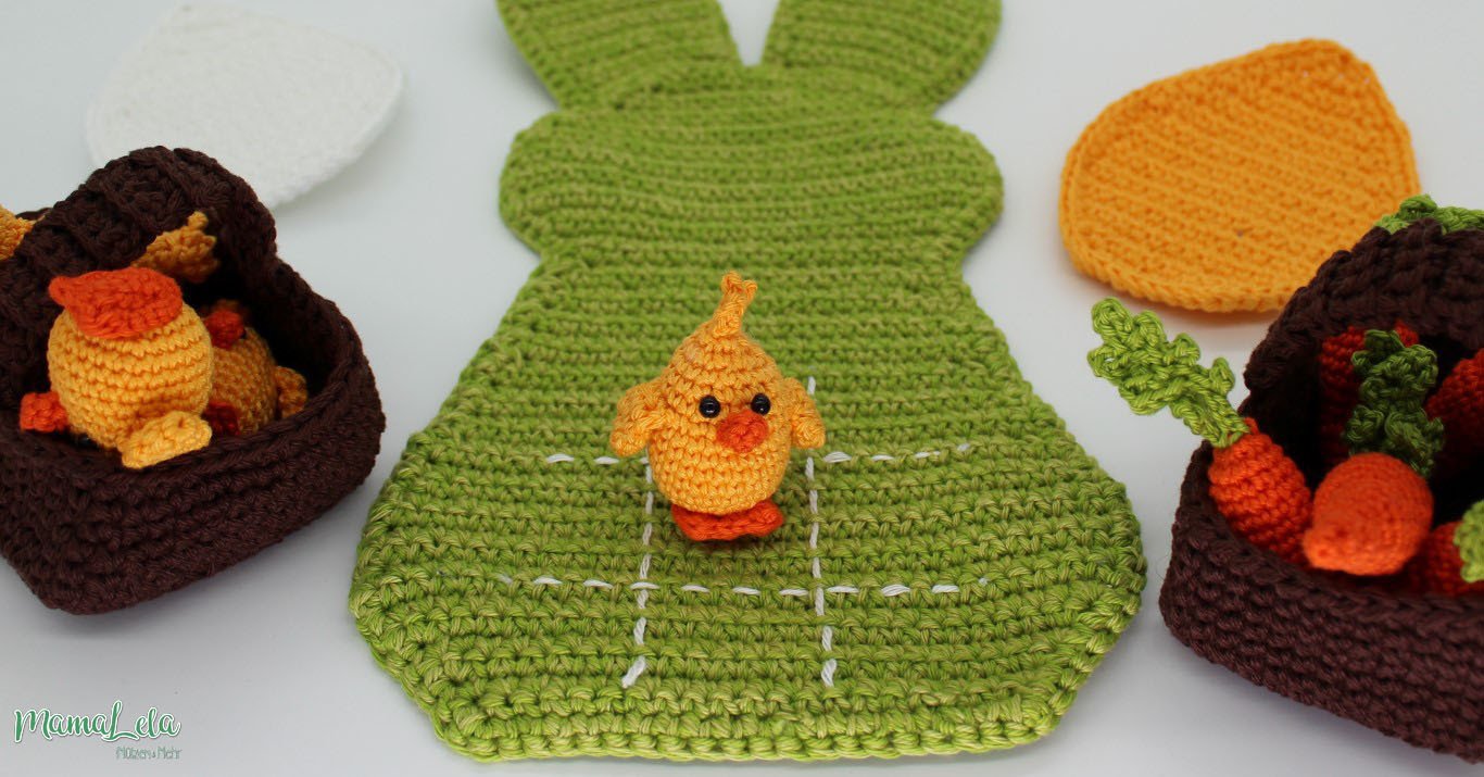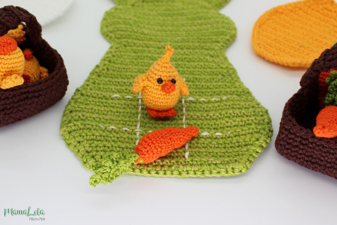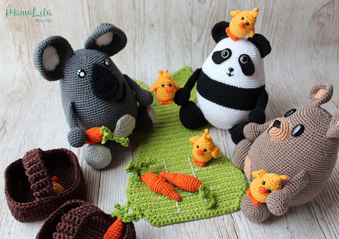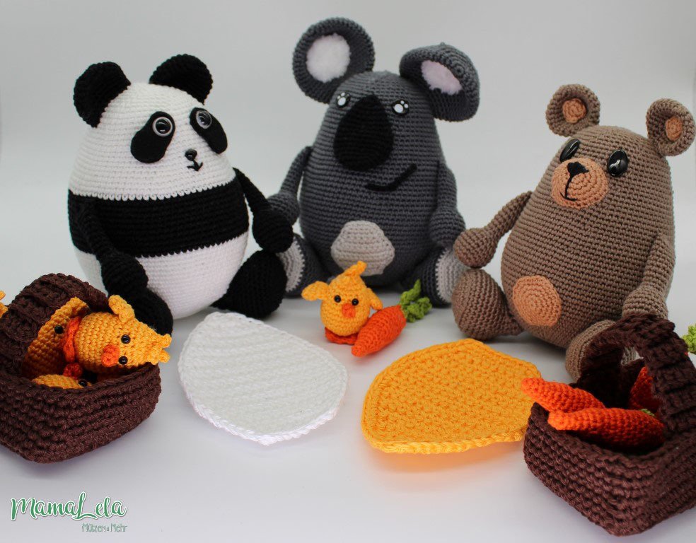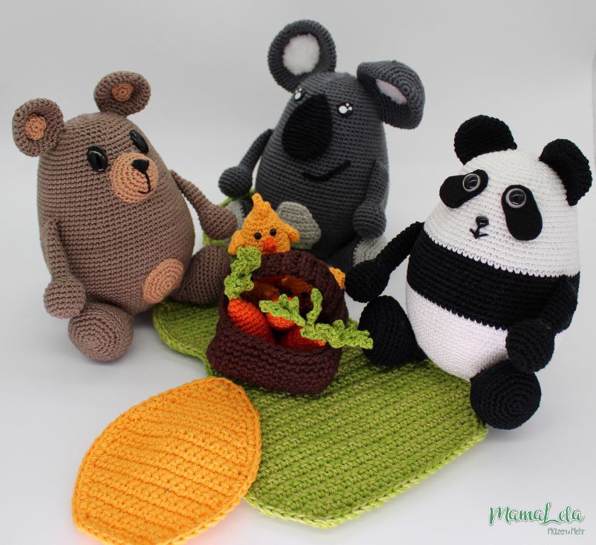 Mit dieser Häkelanleitung könnt ihr euch das im Artikelbild gezeigte Bärentrio samt der Spielwiese und Spielfiguren häkeln.
