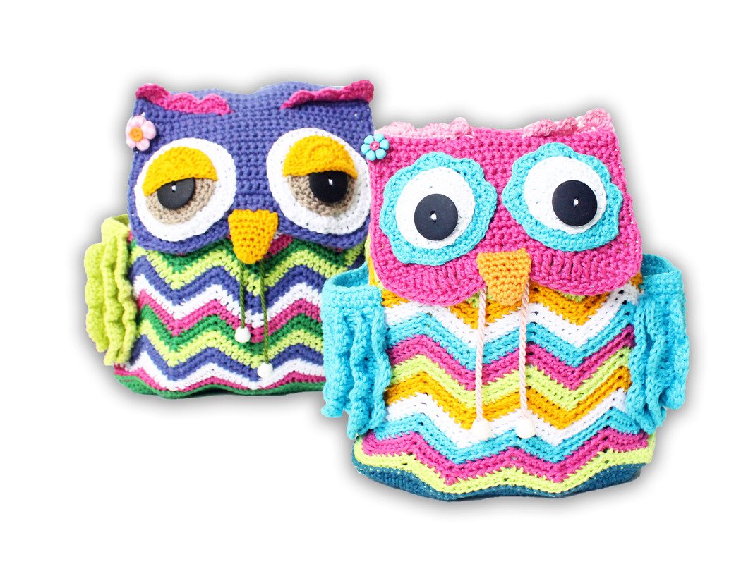 This crochet tutorial consists of illustrated pattern for crocheting two backpacks in the shape of an owl, 2 sizes: 25 cm x 21 cm and 30 cm x 28 cm. The size of the backpacks can be changed very easily. The children can use the backpack either as a kindergarden bag or as a day-to-day bag.