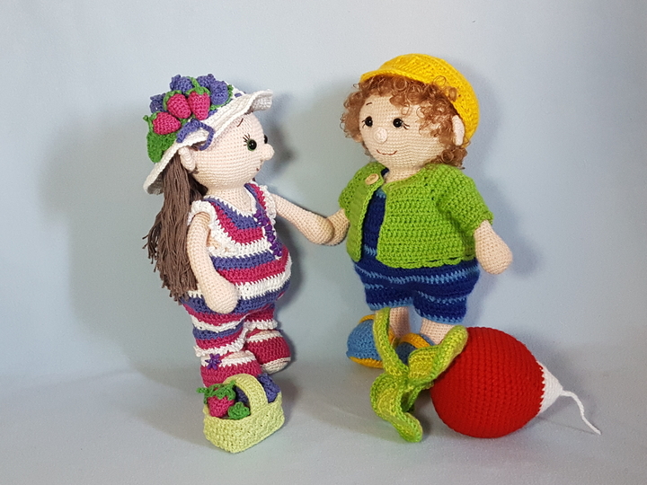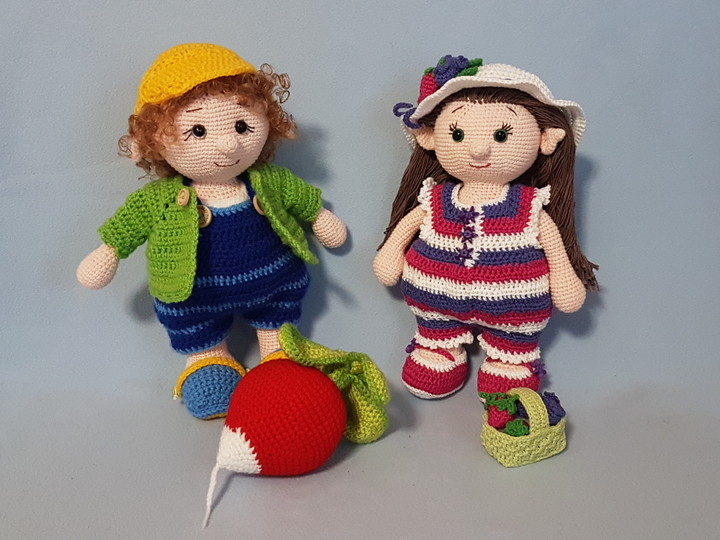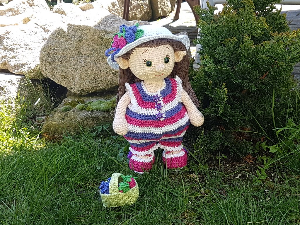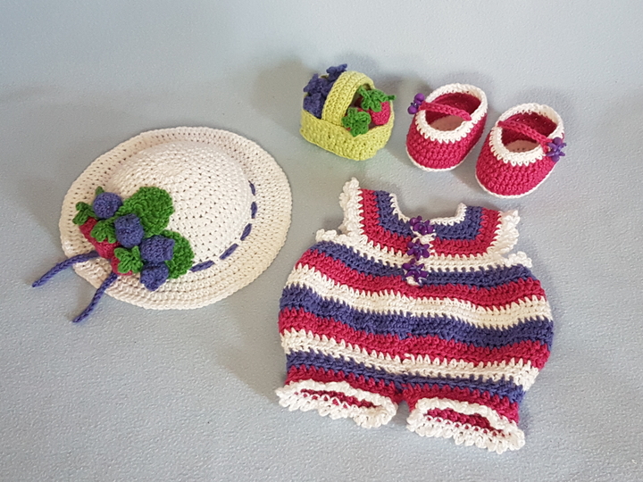 Die PDF beinhaltet die Anleitung für die Pumphose, die Schuhe, den Sommerhut mit Beeren sowie für das Körbchen mit Himbeeren und Blaubeeren.