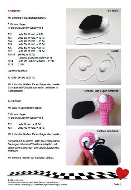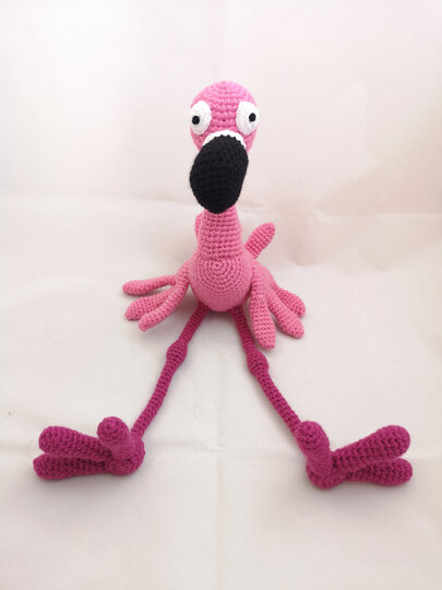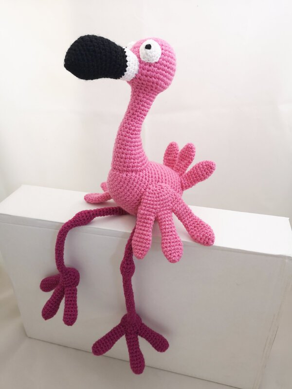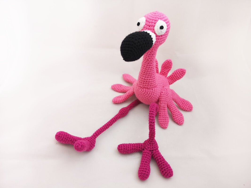 The funny flamingo is easy to crochet and is perfect as a decoration and also as a playmate. Due to the long legs, you can put it perfectly as a decorative figure on a shelf or cupboard edge. If it is crocheted with thinner yarn than indicated here, it can also be used as a bag dangling or hung in the car.