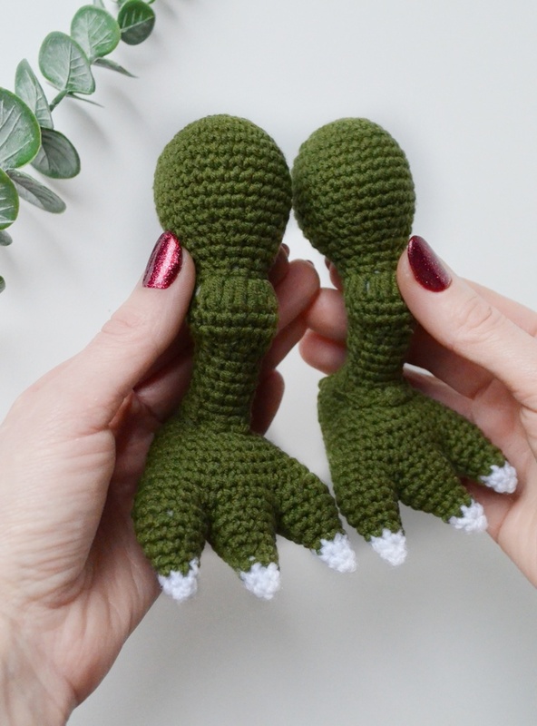 Green color yarn for the body(YarnArt Jeans color 82 about 60 g) and white for eyes, nails and teeth (YarnArt Jeans color 62 about 7g)