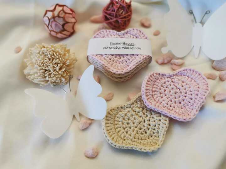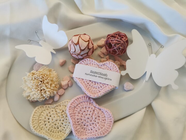 Du kannst mit Hilfe dieser Anleitung tolle Kosmetikpads in Herzform nacharbeiten. Diese Kosmetikpads sind super geeignet um geliebten Menschen eine zuckersüße Freude zu bereiten. Sie sind optimal für Muttertag oder für den Geburtstag der Freundin, Mama, Kollegin oder Schwester geeignet. SIe sind mit der angegebenen Wolle wieder verwendbar und bei 60 Grad waschbar. So kannst du deinen Liebsten ein umweltfreundliches Geschenk machen. Damit tust du gleich zweimal was Gutes.