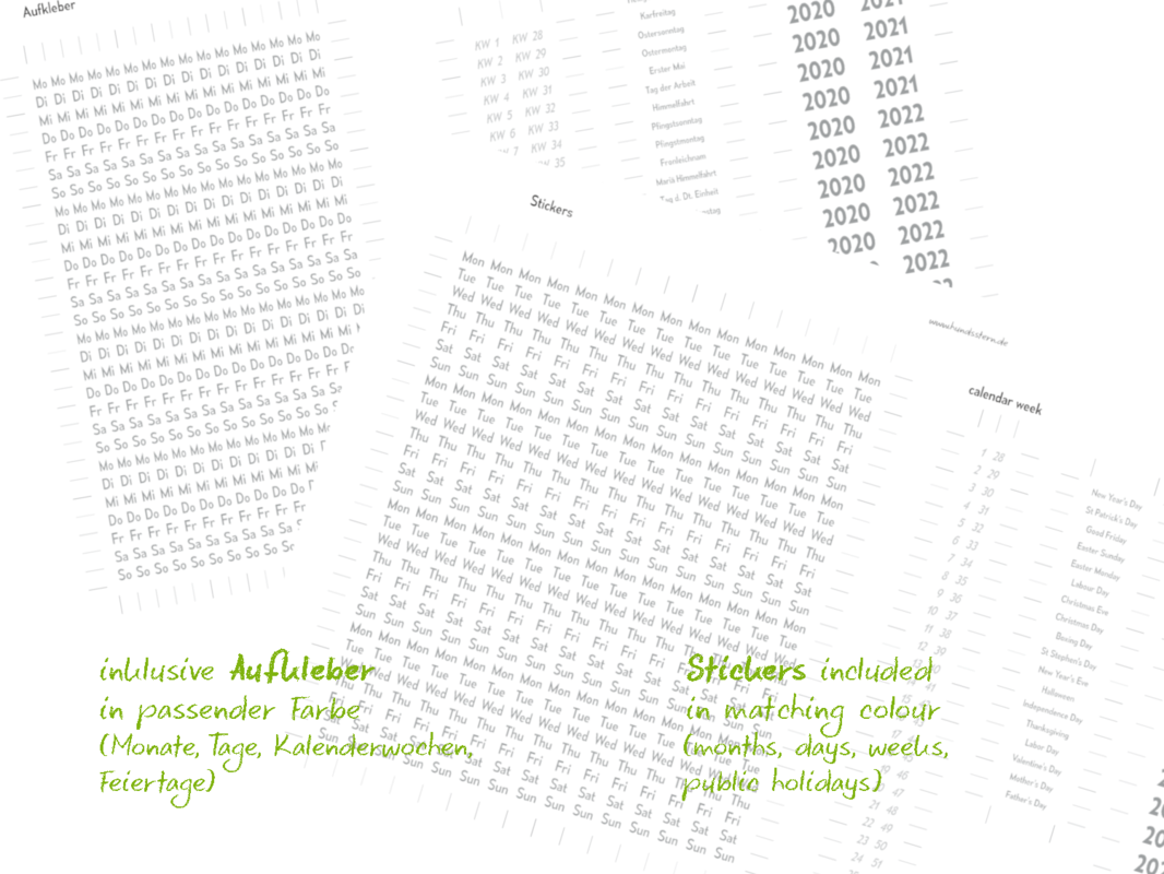 includes stickers in matching colour for weekdays, calendar weeks, public holidays, years