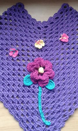 This is a pattern for a Childs Poncho. Worked using dk/light worsted cotton and 3.5/E hook.This is a very easy and quick pattern. Crochet butterflies and flowers are used to embellish poncho to give a spring look.