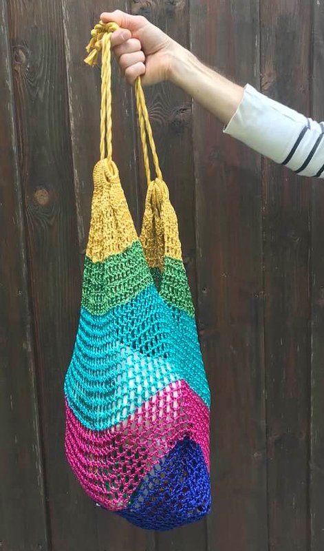 der Einkaufsbeutel ist um die 60 cm lang und ab dem türkisen Streifen - gedehnt- 50cm breit