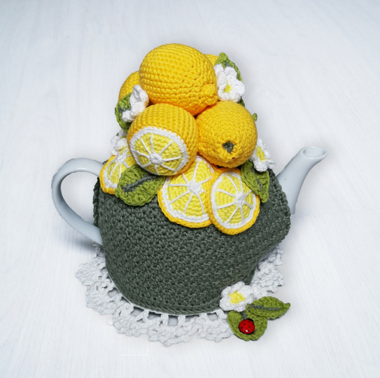 Yarn : Original tea cosy was worked using Rico Creative Ricorumi DK: Olive 048 – Tangerine 026 – Pea 077 – White 001 – Yellow 006