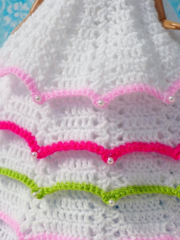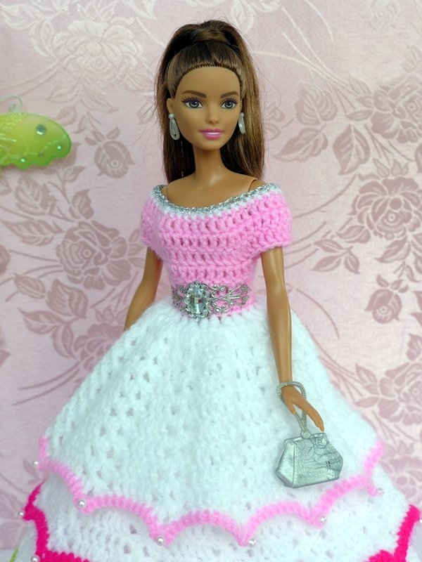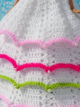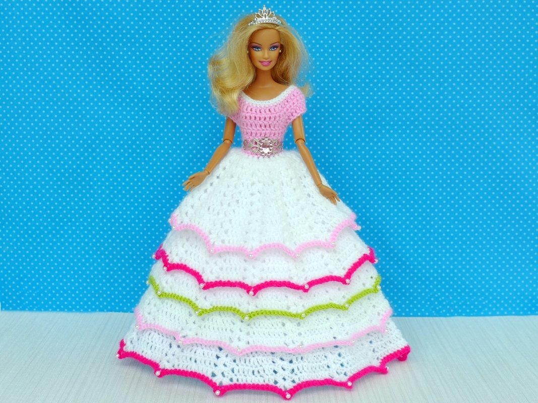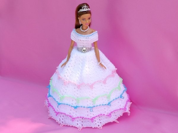 Following my instructions you can crochet all the dresses you see in the photo gallery yourself. I describe and show you exactly how to make all the different types of dresses (basic dress with 4 or 5 skirt levels, dress with pearls in the lace, dress with Rocailles pearls on the edges, flower for the dress or hair, veil and tutu).