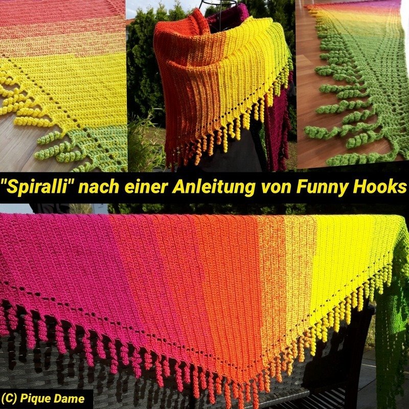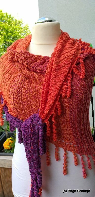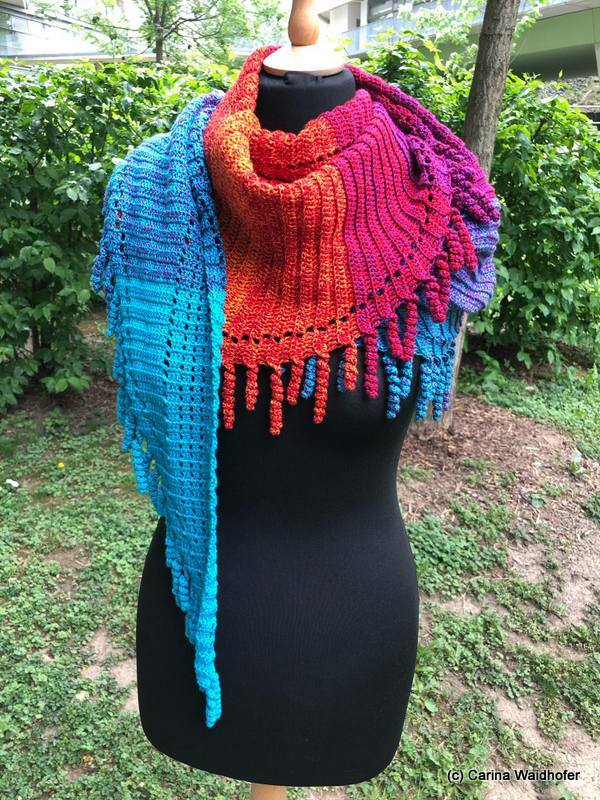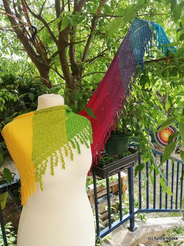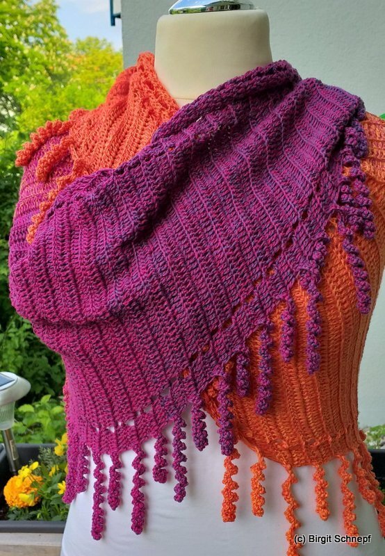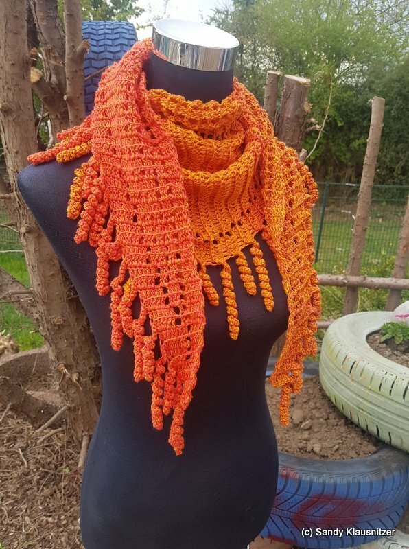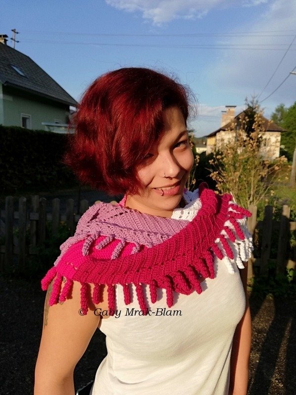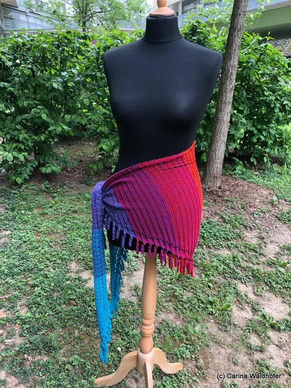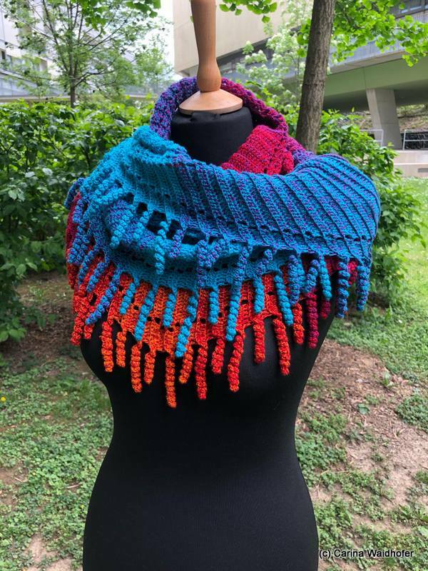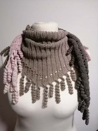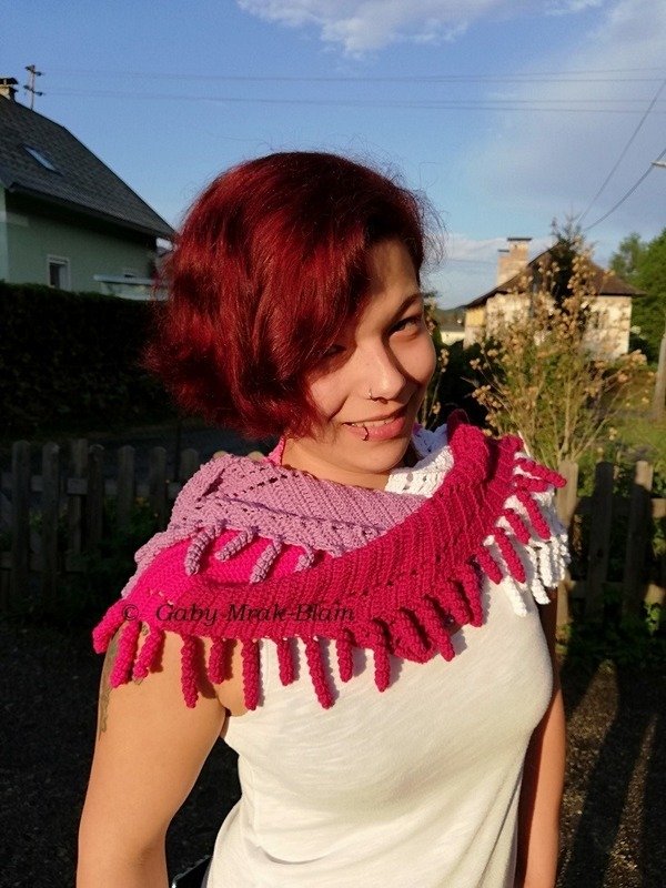 the "spiralli" scarf is made as a bactus and with its "curls" is a real eye-catcher. The scarf also tolerates a lot of color and looks funny and playful. Because of the bactus shape, the tip doesn't get too deep either.