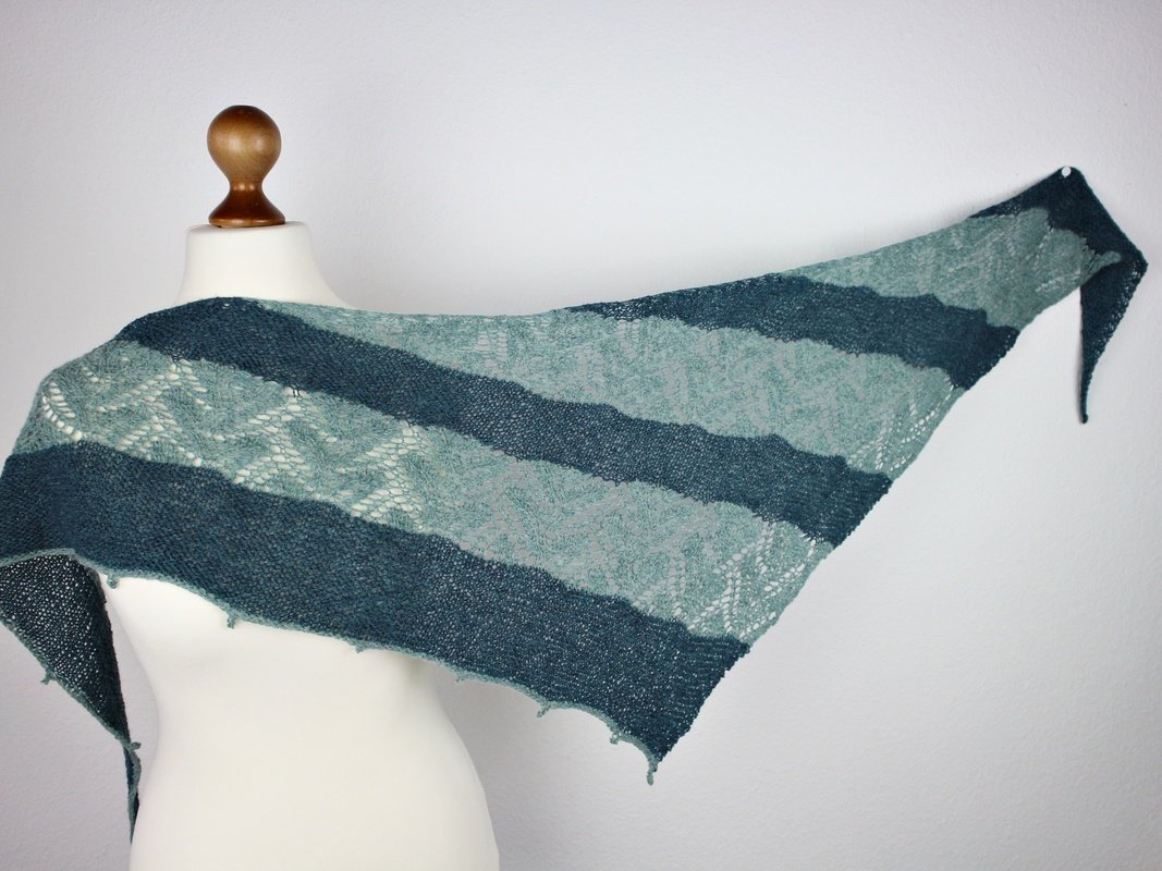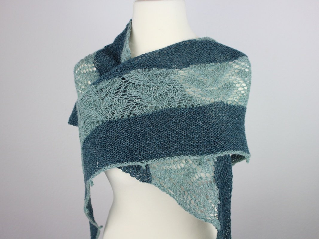 This shawl is worked in one piece and seamless. Relaxing garter stitch parts change with a ambitious lacepart. The lacepart needs your concentration.