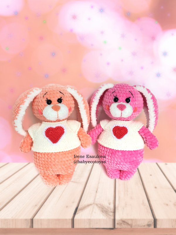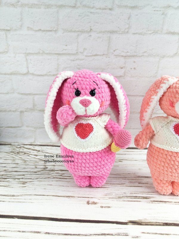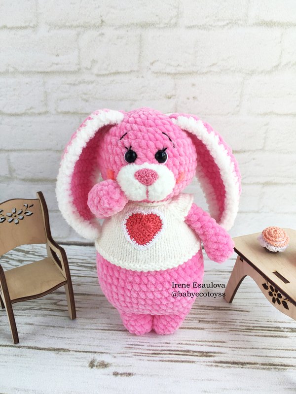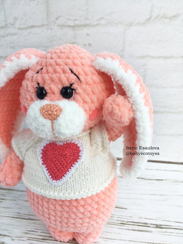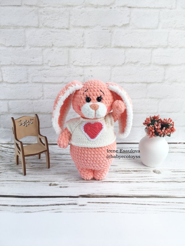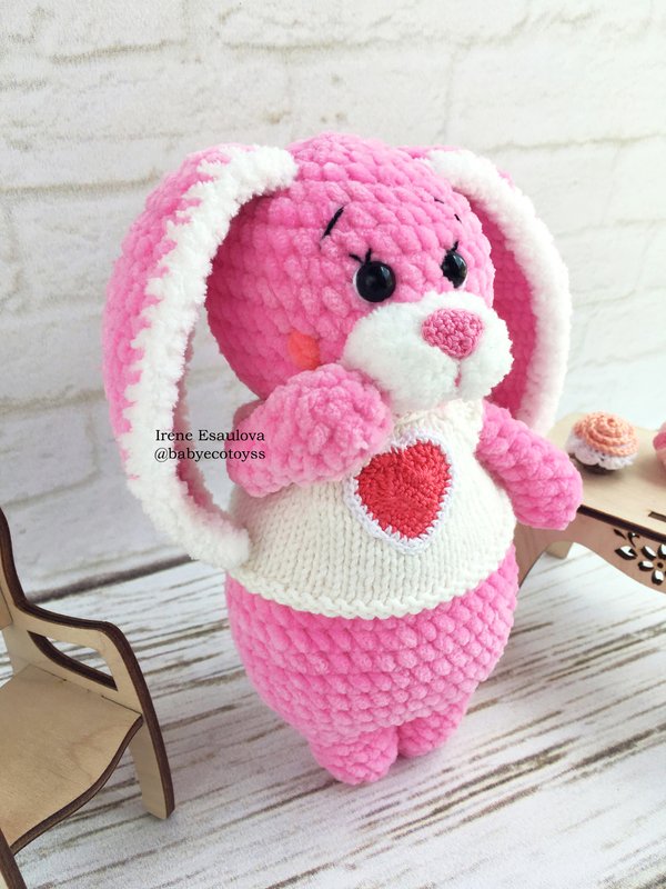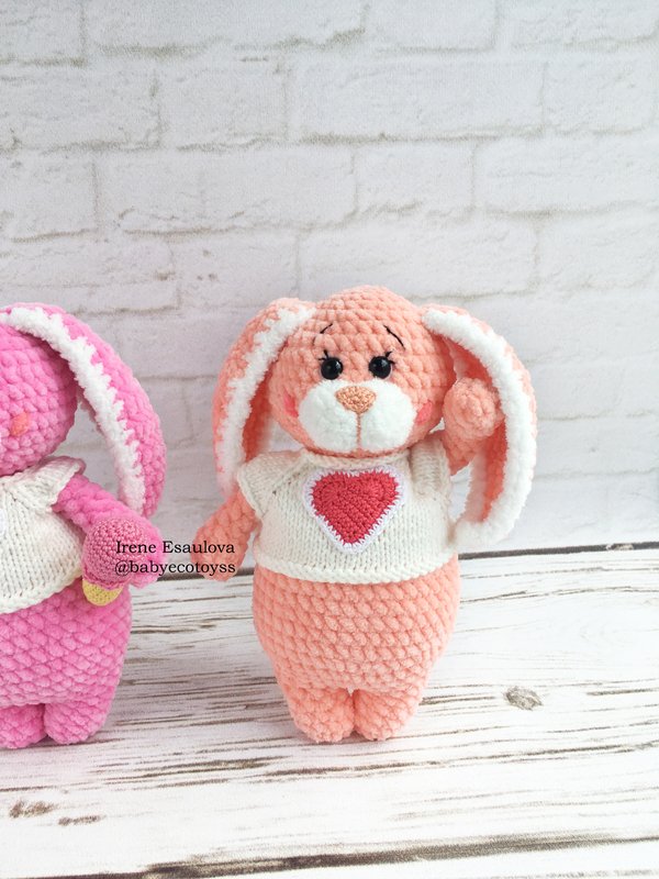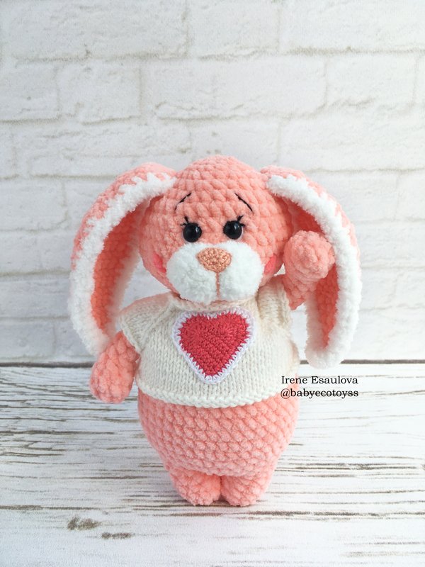 This pattern includes a description for the toy (crochet), jacket (knitting), and heart (crochet). Bunny measures approximately 20 cm (7,8").