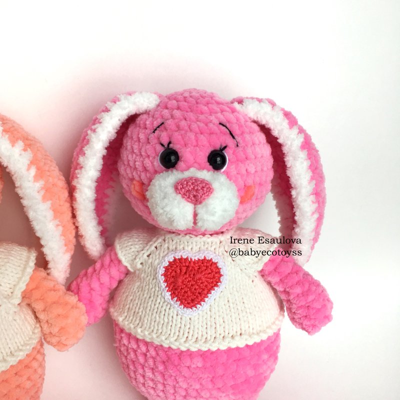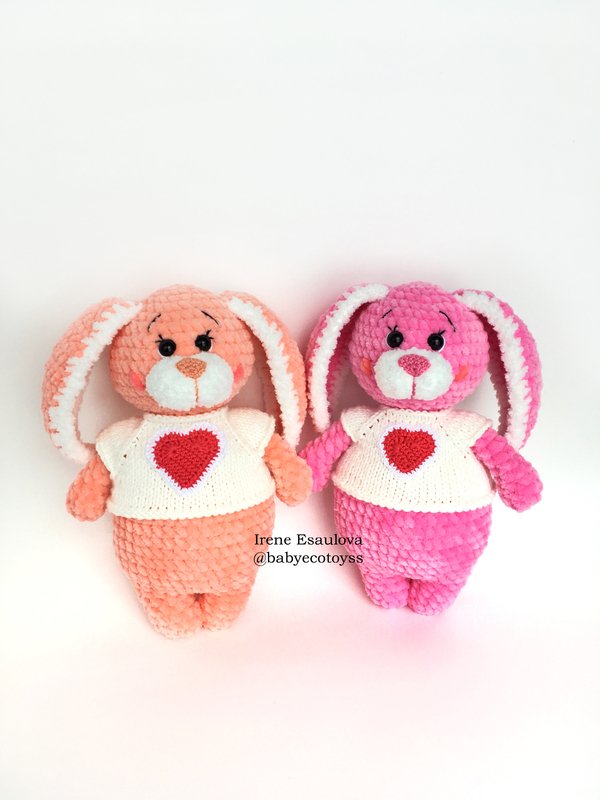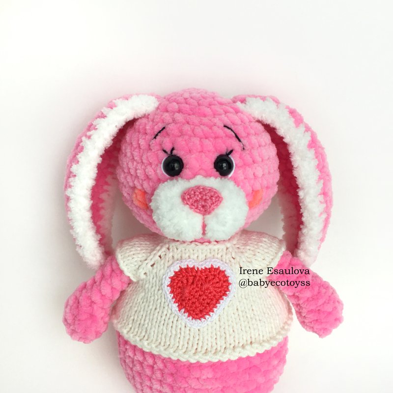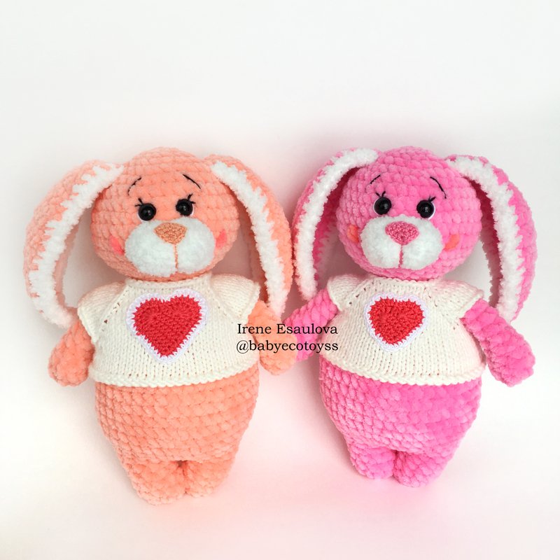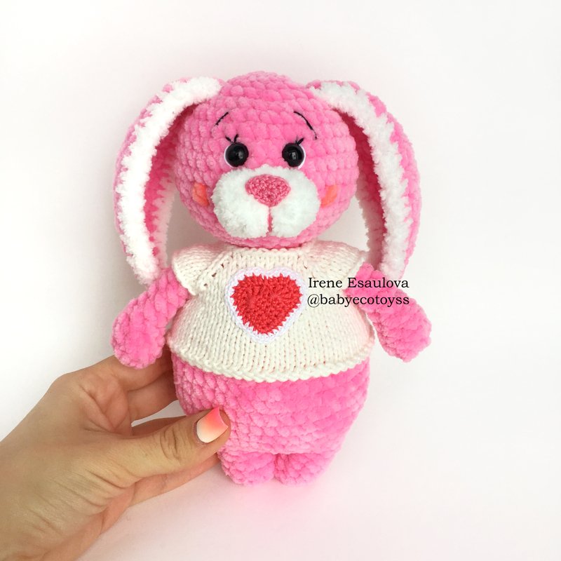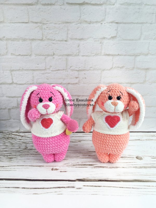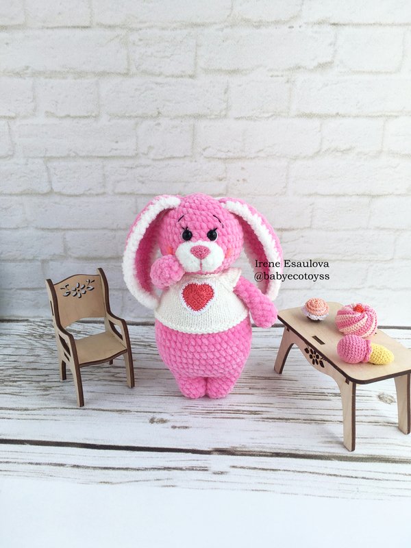 This pattern includes a description for the toy (crochet), jacket (knitting), and heart (crochet). Bunny measures approximately 20 cm (7,8").