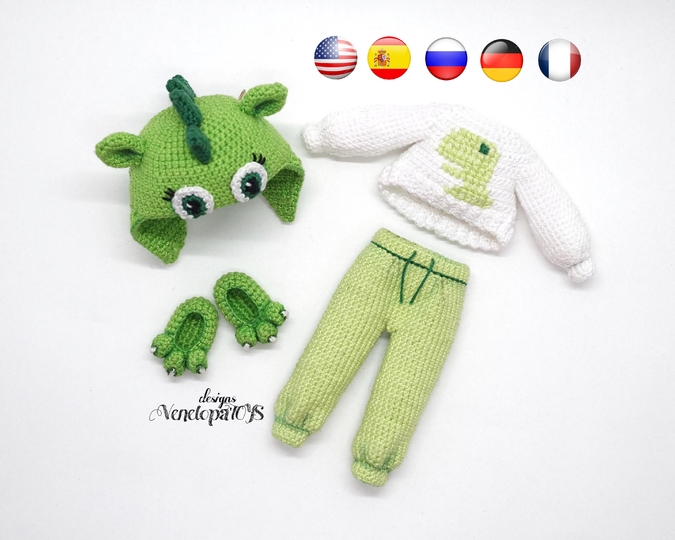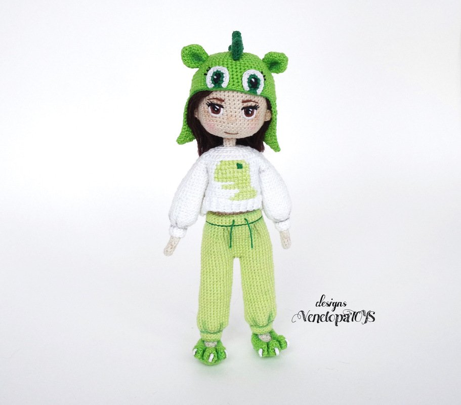 Please note that this is a crochet pattern (PDF file), but not a toy. This crochet pattern contains a detailed description of how to create clothes for Doll in dinosaur pajamas, with a great amount of step-by-step photos and a list of necessary materials.