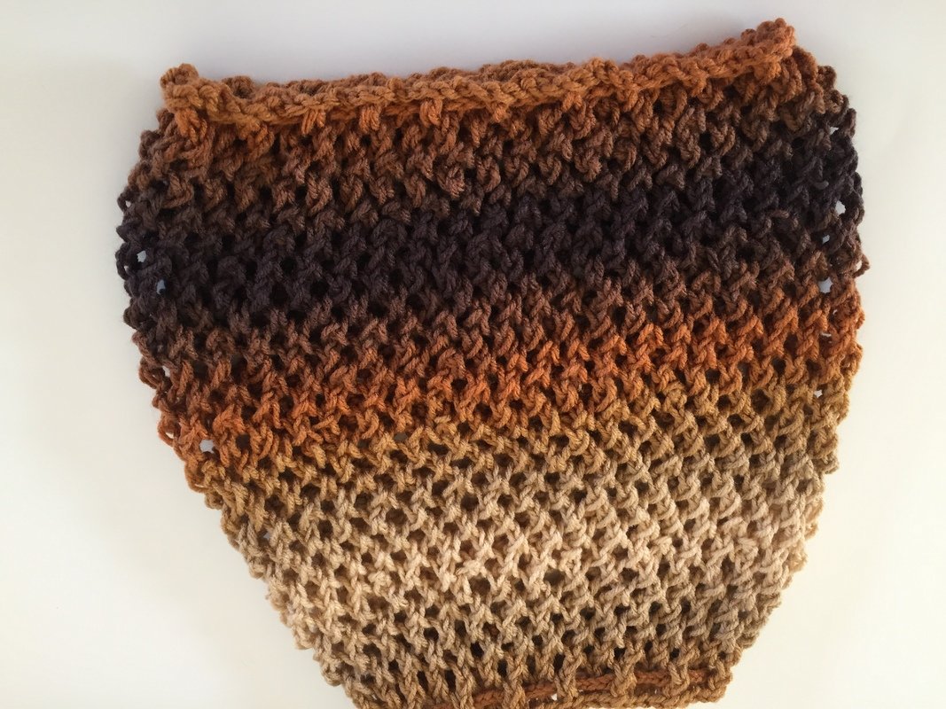 I used: 1 ball Red Heart Super Saver Stripes in Latte Stripe worsted weight #4 – 236 yds/215 m/141 g/5 ozs.