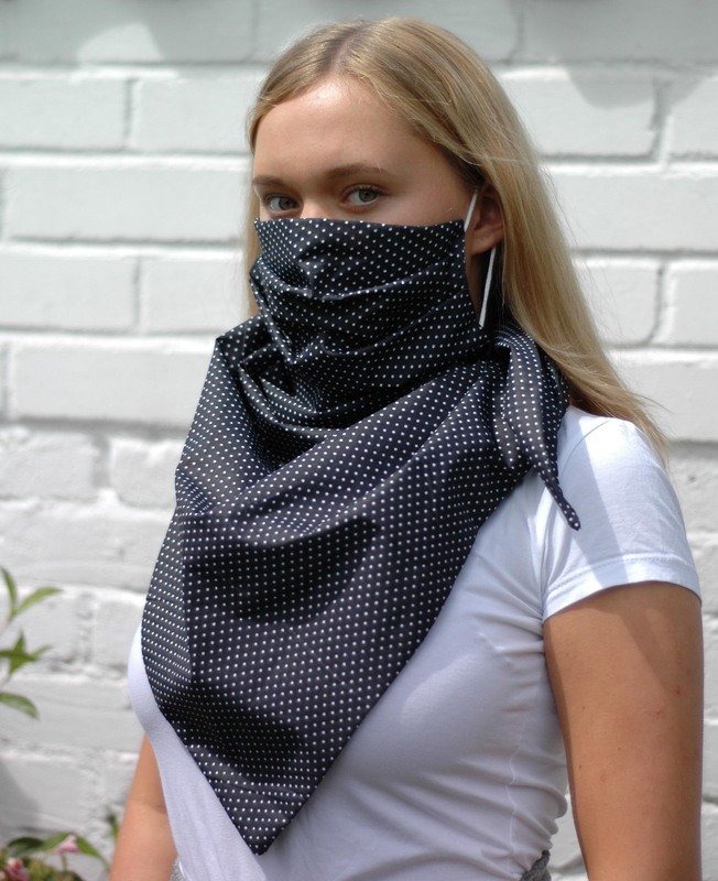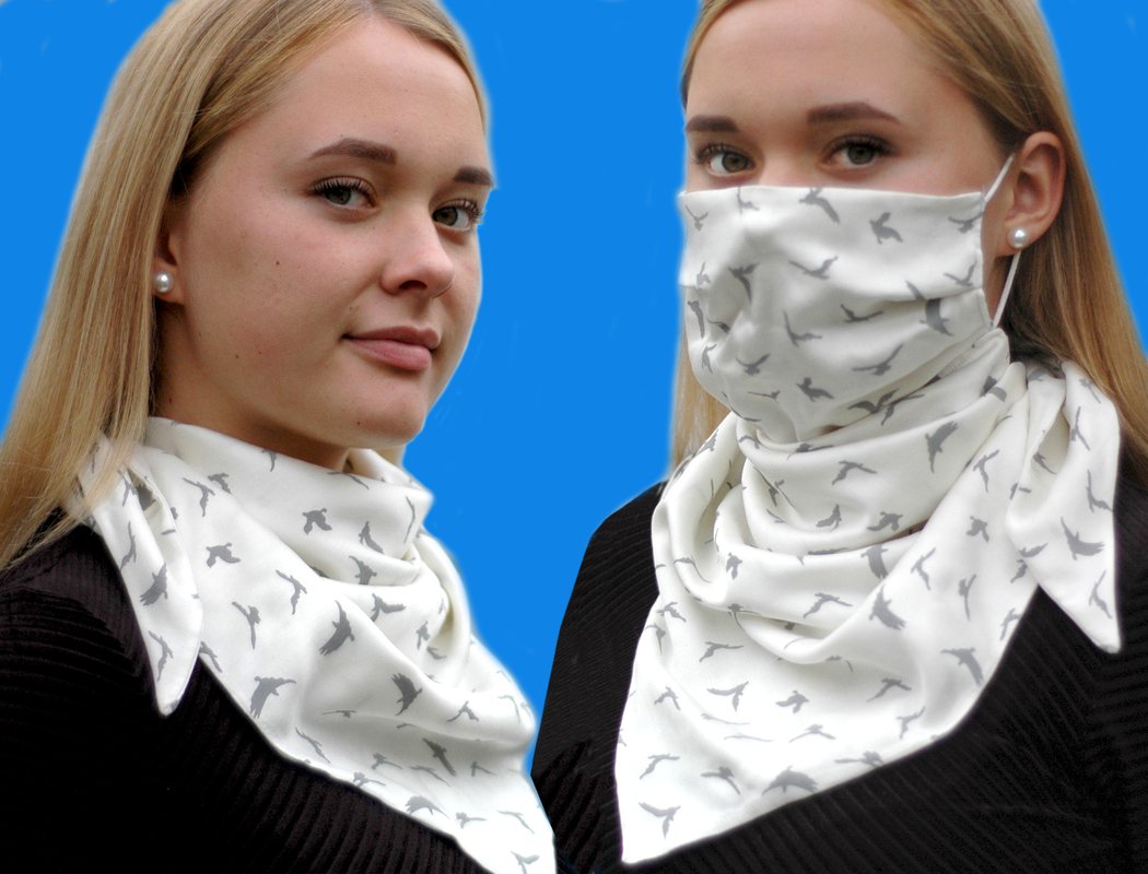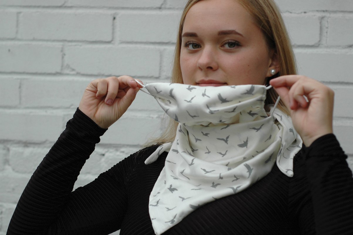 Nicht nur ein Tuch, sondern kann bei Bedarf auch vor das Gesicht gezogen werden. Die eingearbeiteten Ohrschlaufen verhindern das Verrutschen.