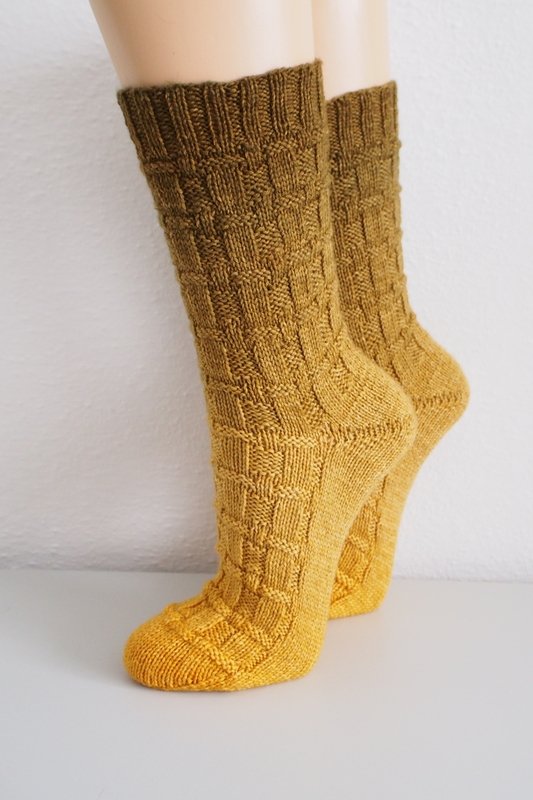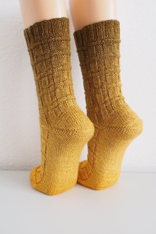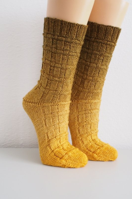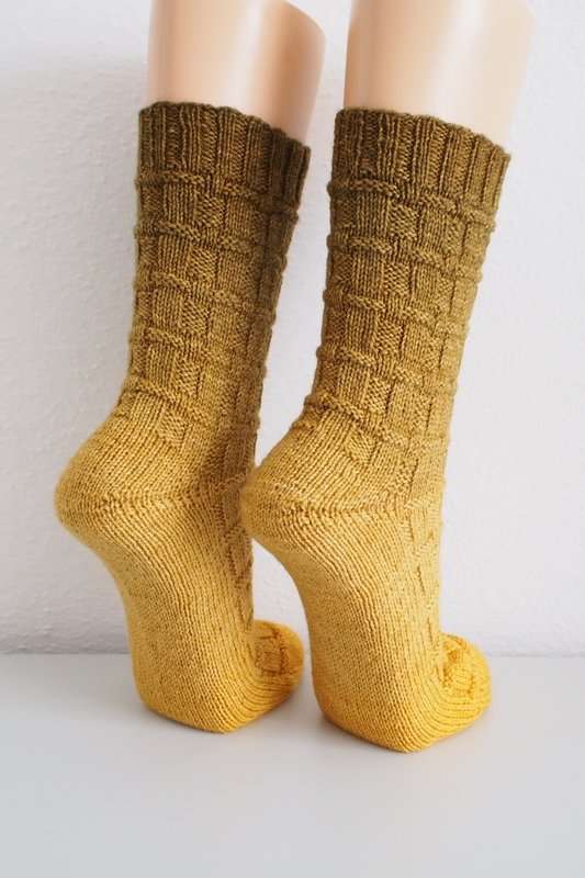 These socks have an easy knit and purl pattern which looks like it is woven. It‘s great for beginners and easy to memorize. You can make the leg longer or shorter, both socks are knitted the same way.