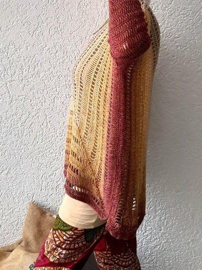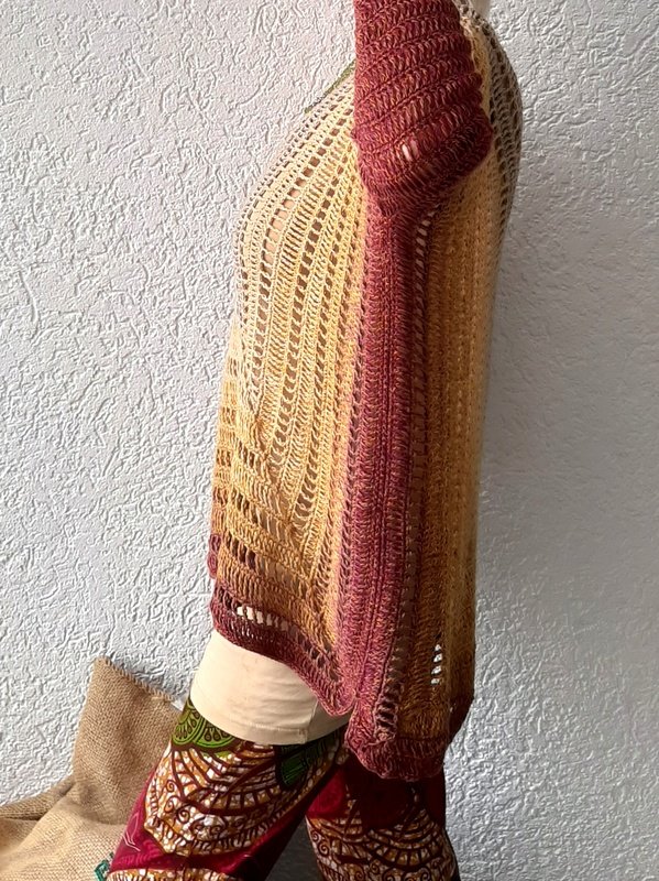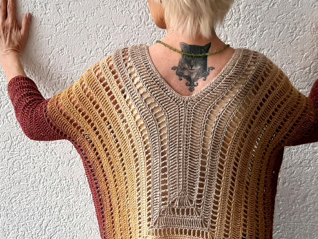 Der luftige Ponchollover "Träumchen" ist durch seinen weiten Schnitt sehr leicht an alle Größen anzupassen und ein wahres Häkelvergnügen. Er kann auch ohne Ärmel als Shirt gehäkelt werden. Vorder- und Rückenteil werden vom Halsausschnitt an, immer in Runden gehäkelt. Die Ärmel werden zum Schluss direkt angehäkelt. (Für häkeln mit Farbverlaufsgarn: Es werden keine extra Armbobbel benötigt. Sie werden aus dem letzten Farbverlauf gehäkelt.) Seitlich hat der Ponchollover kleine Schlitze. Das Muster ist ein einfaches, aber sehr effektvolles Muster mit einer tollen Wirkung. Wir häkeln Stäbchen, Doppelstäbchen, Dreifachstäbchen und feste Maschen. Alles erkläre ich in Fotostrecken, Textanleitung sowie eine, am PC erstellte Häkelschrift für Vorder- und Rückenteil ab Halsausschnitt, sowie Ärmel. Es ist NICHT nötig die Häkelschrift lesen zu können, da ich Schritt für Schritt, mit Foto´s und Text erkläre wie gehäkelt wird. Bei Fragen stehe ich zeitnah zur Verfügung.