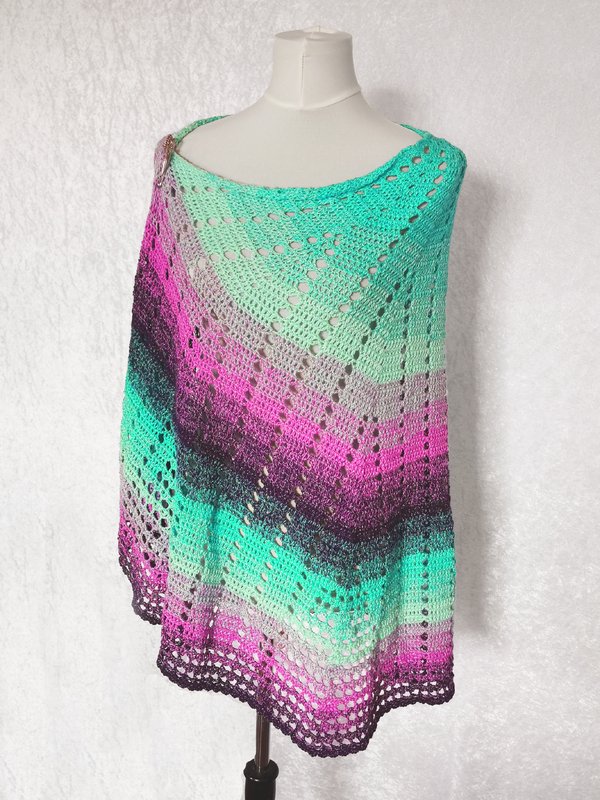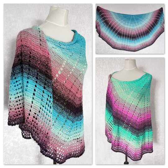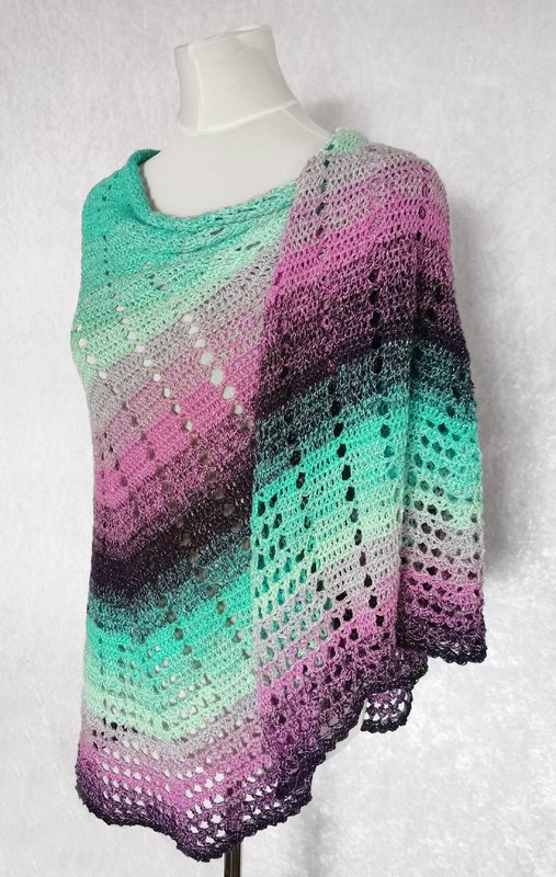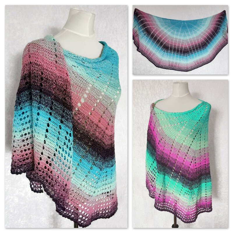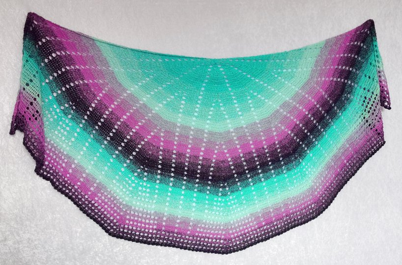The crochet pattern for this semicircular wrap runs over 9 pages. It contains an extensive written tutorial, detailed and professionally created crochet charts and photos.