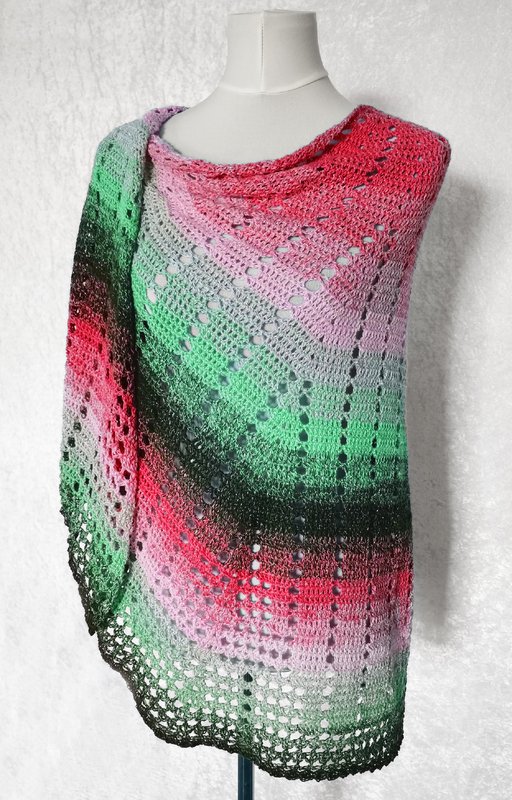 The measurements can vary depending on your own crochet style, the wool you choose and the needle size you use. My shawl measures 200 x 80 cm.