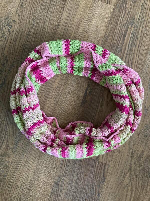 Diese Anleitung beeinhaltet auch eine Kurzanleitung, wie das Muster zu einem Loop oder Schal verarbeitet werden kann, mit Häkelschrift. Dieser Zusatz ist aber nicht komplett ausgeschrieben.