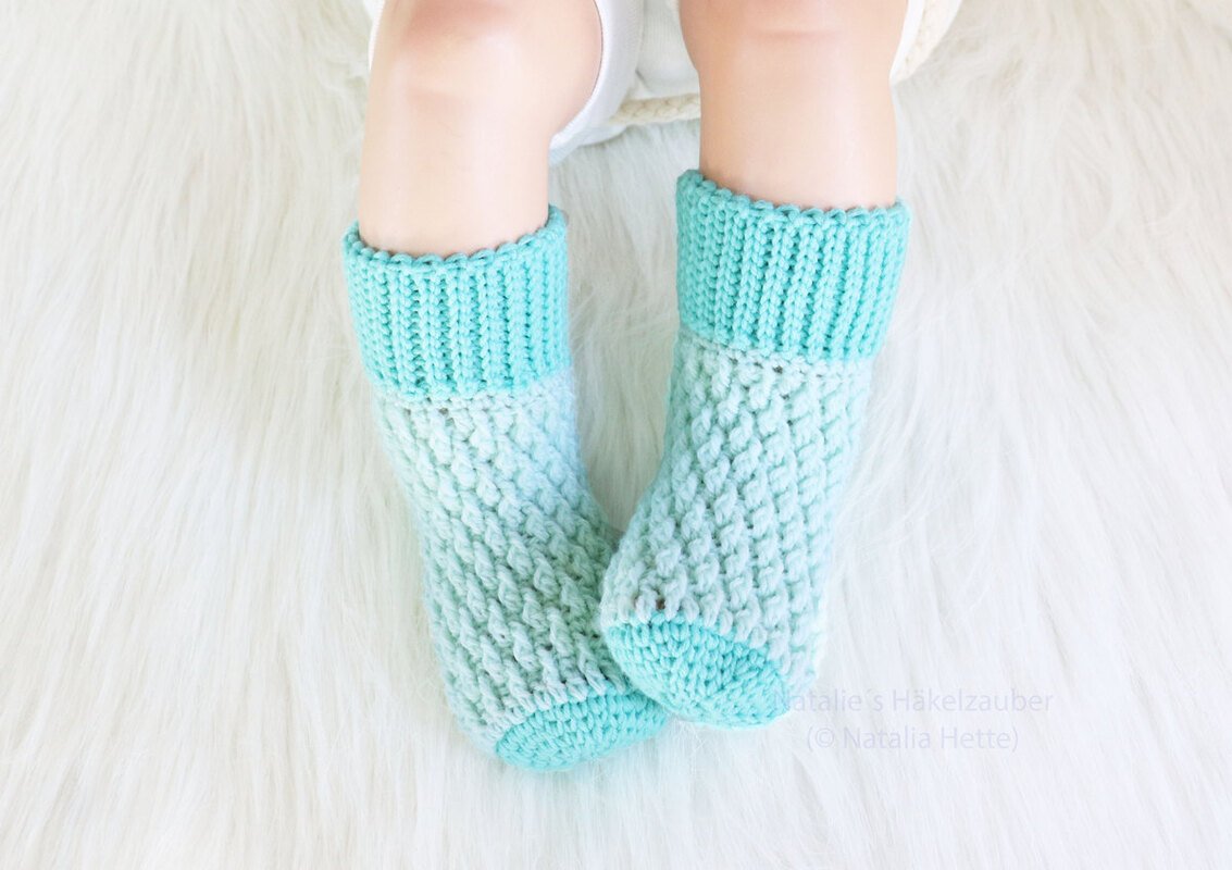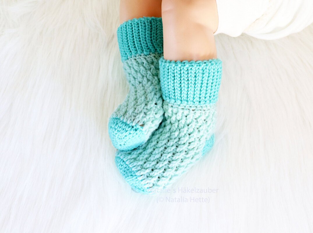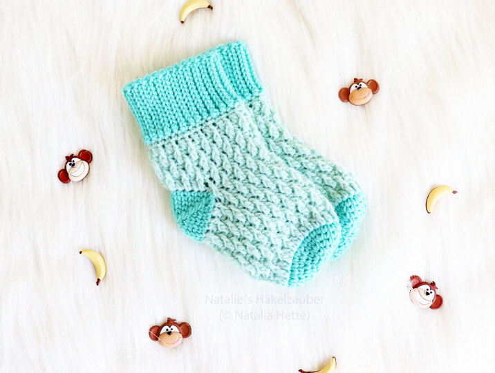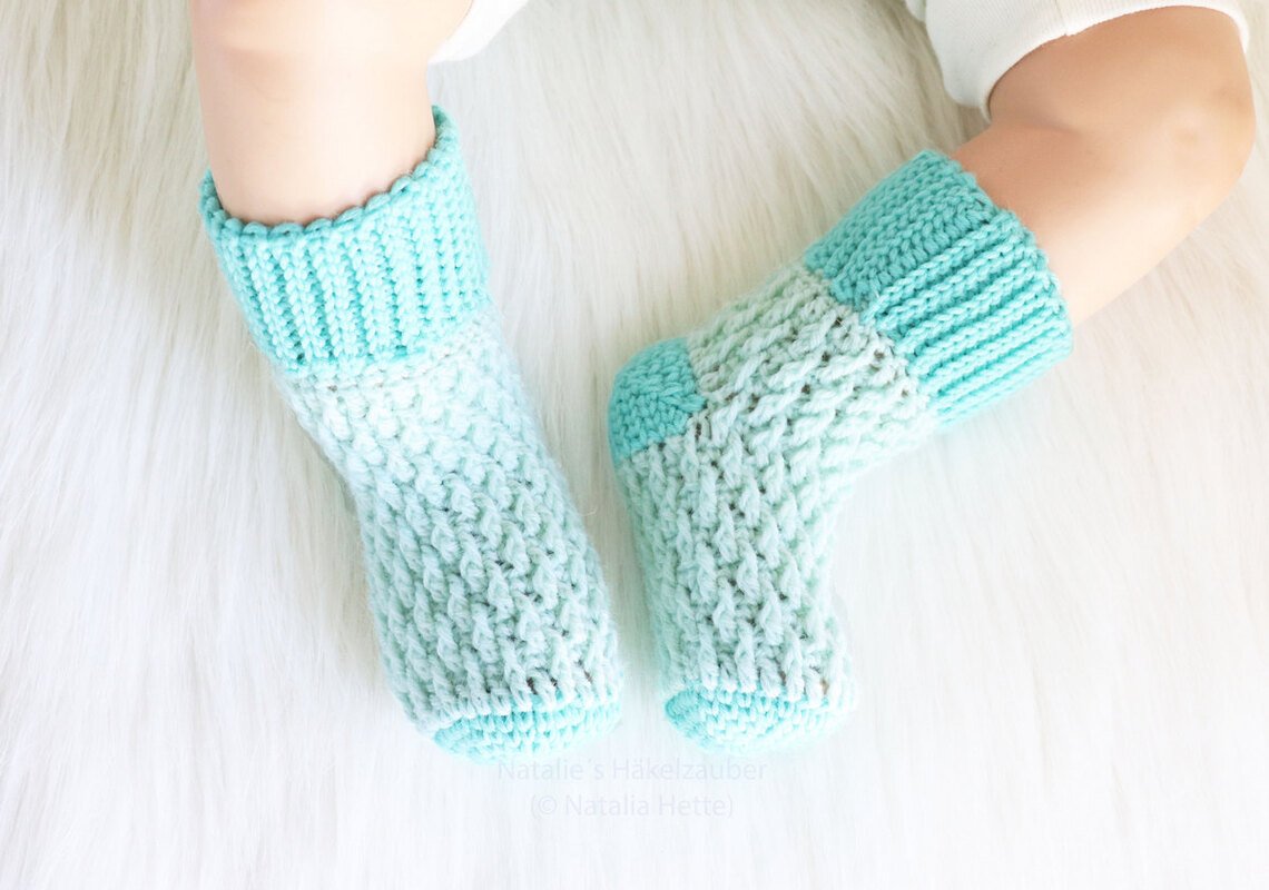 Crochet soft baby & children's socks with the relief pattern quickly and easily for your child or grandchild is no problem at all with this crochet pattern! A relief pattern and knit look cuffs make these socks a real eye-catcher!