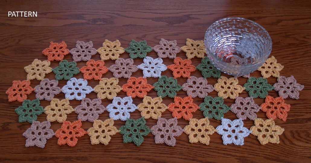 This offer is for a crochet pattern from Nancy Brown-Designer - a pattern for a floral garden to decorate your table. This offer is for the pattern only, not the finished table runner.
