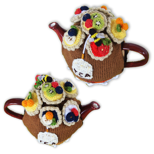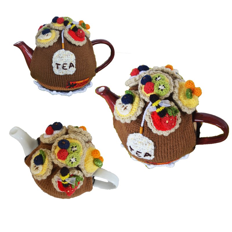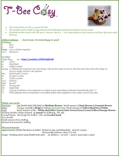 The tea cosy pattern is suitable to fit a 4-6 cup tea pot. The cosy is knitted flat, but bring out your crochet hooks and make the tartlet casing and all the fruits and custard and cream and jam.