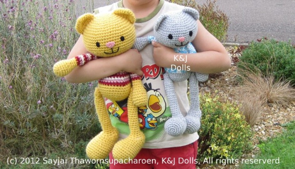 Crochet pattern to create a large cat doll. The legs and arms are joined to the body with invisible buttons: they can move.