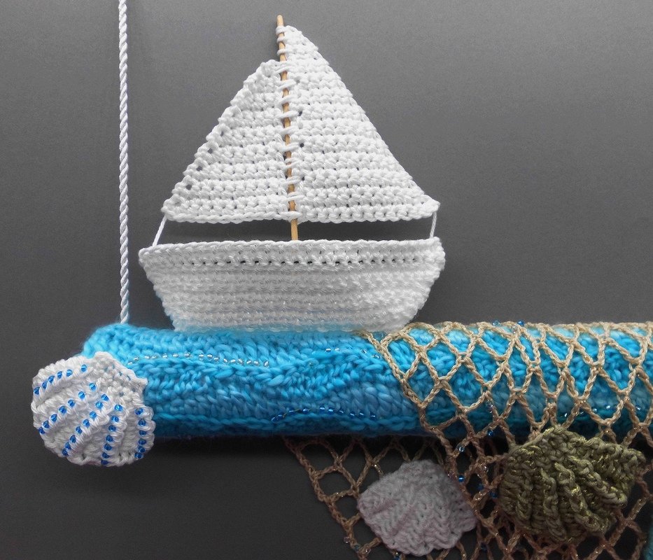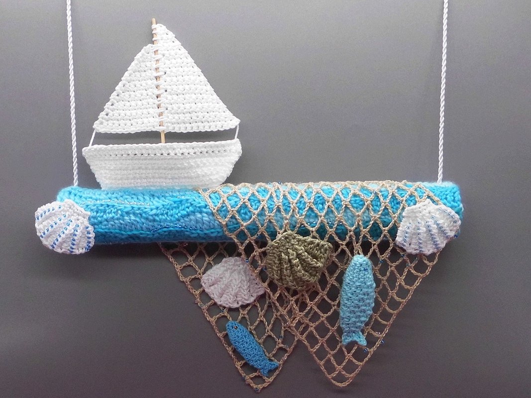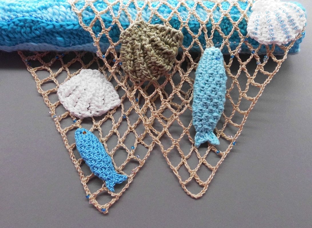 Die PDF-Datei umfasst die Anleitungen und Häkelschriften für das Segelboot, den Querstab, das Fischernetz und die Muscheln, sowie die Häkelanleitung für dieFische mit ihrem hübschen Schuppenkleid.