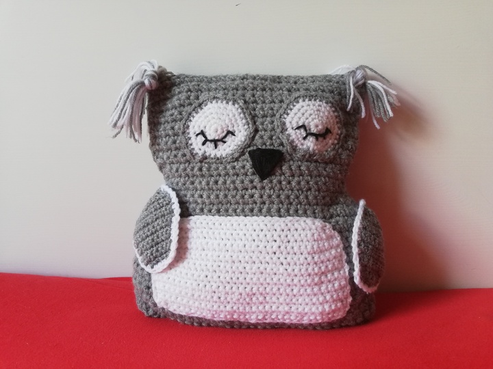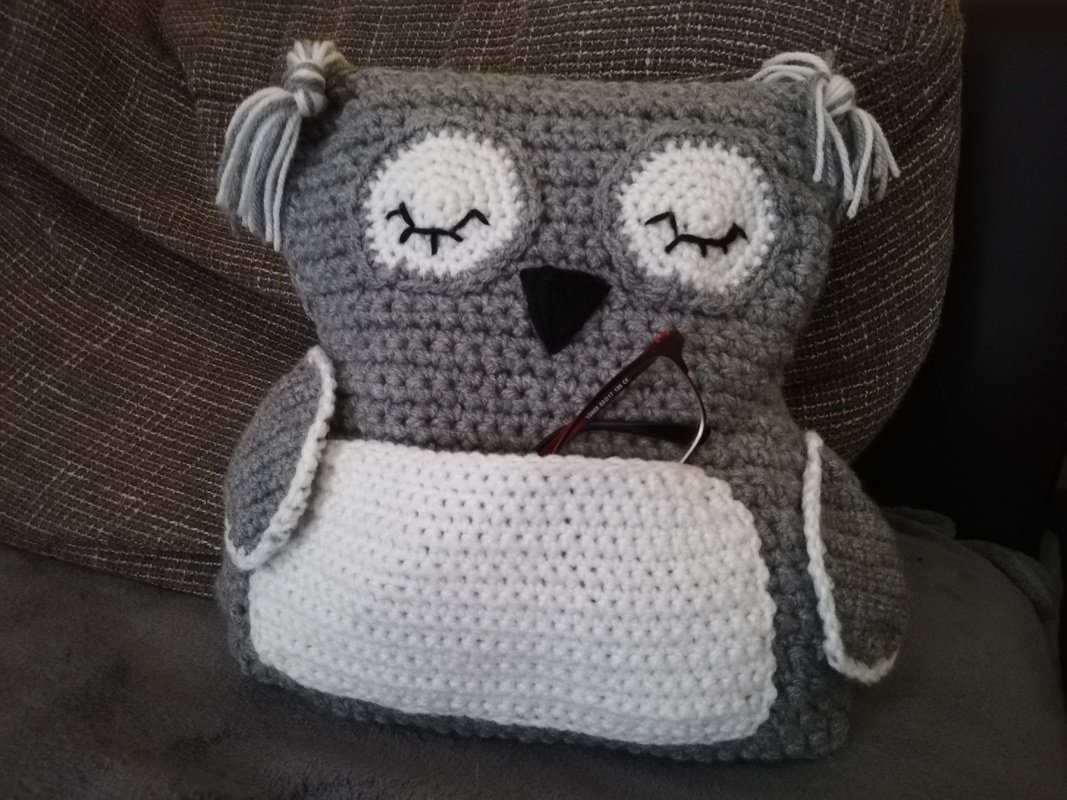 Dieses süße Eulenkissen hat eine Bauchtasche, ideal um etwas zu verstauen. Ob nun Häkelnadel, die Brille oder anderes.