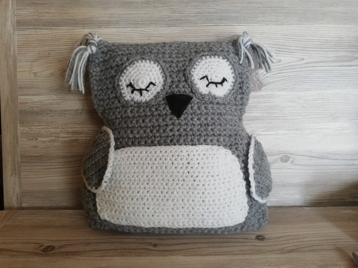 Das Eulenkissen ist 28 cm hoch und 30 cm breit, an der breitesten Stelle