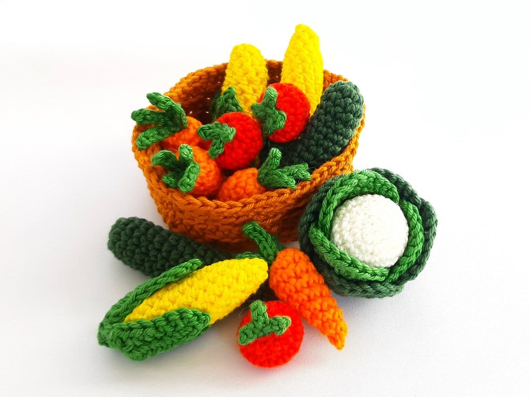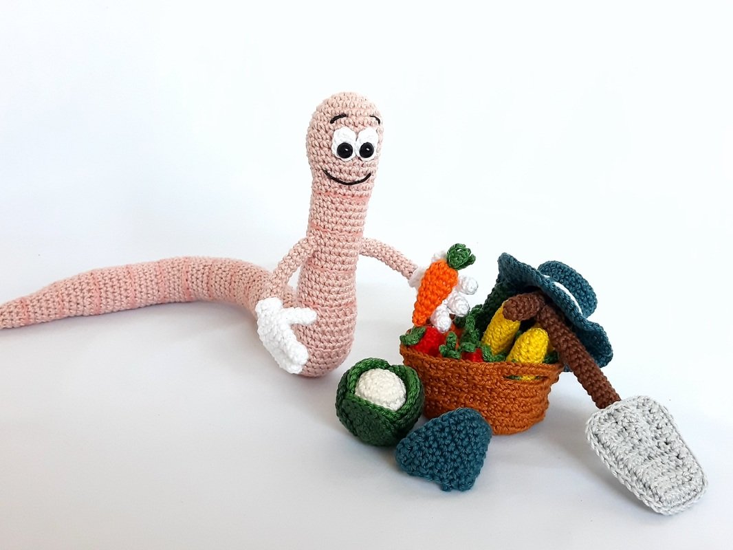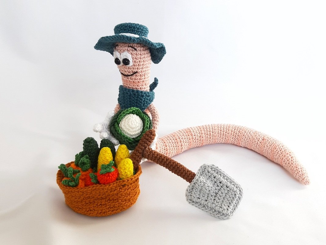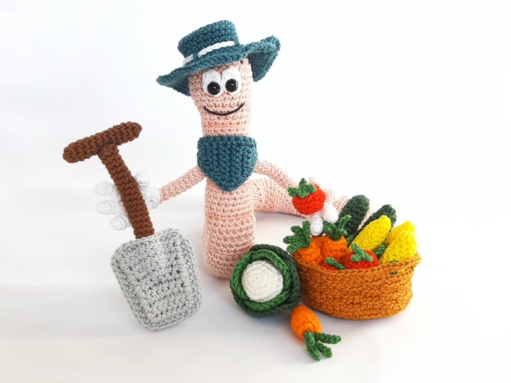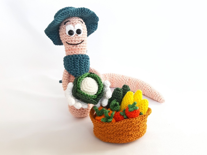 Mit dieser PDF erhalten Sie eine Häkelanleitung für den Regenwurm mit seinem Hut und Halstuch, der Schaufel und dem Gemüsekorb mit Möhren, Tomaten, Blumenkohl, Maiskolben und Salatgurken.