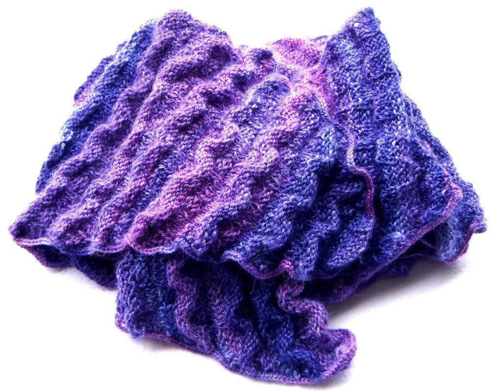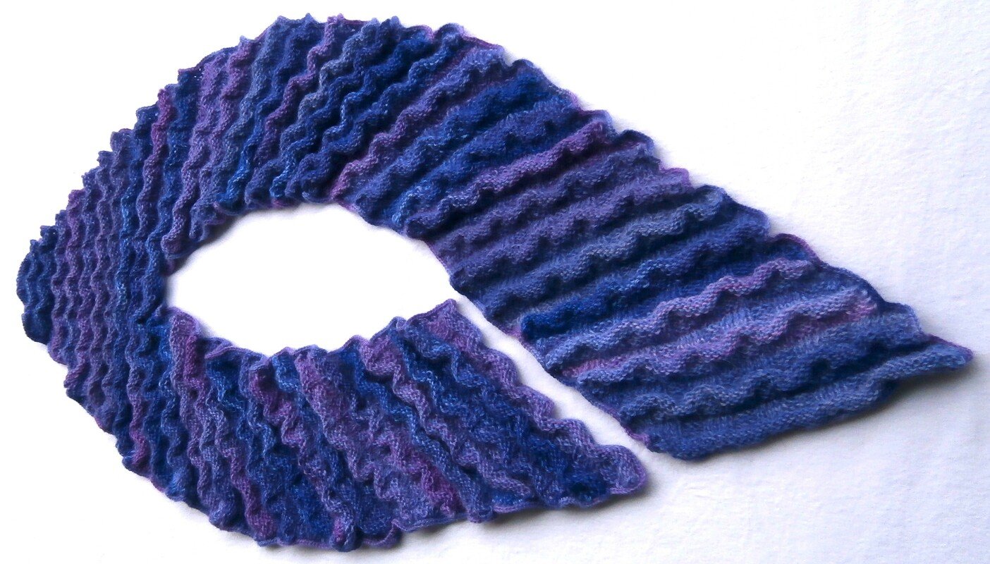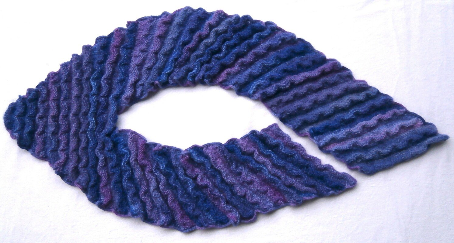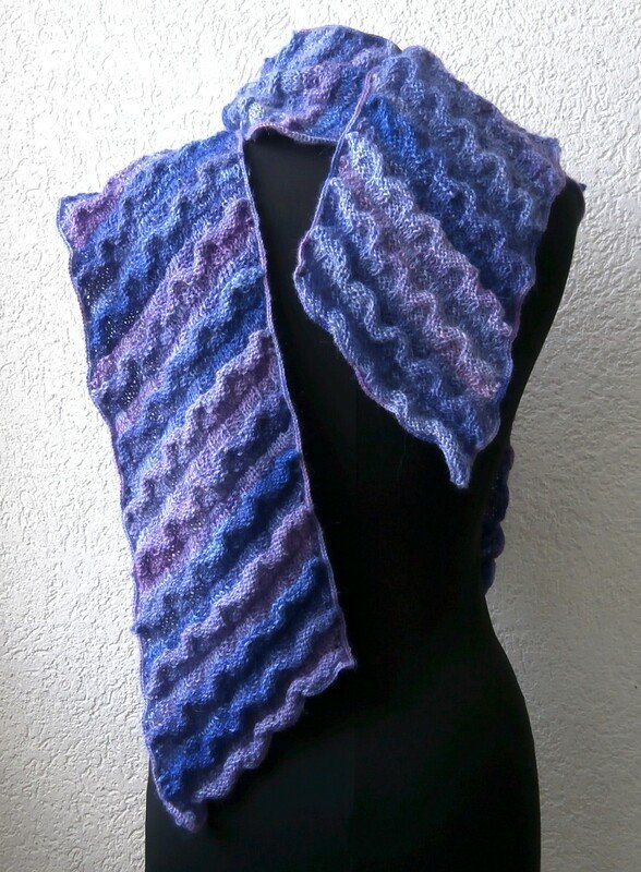 A V-formed scarf in a whizzy wave pattern. Specially suitable to wear with a coat or a jacket.