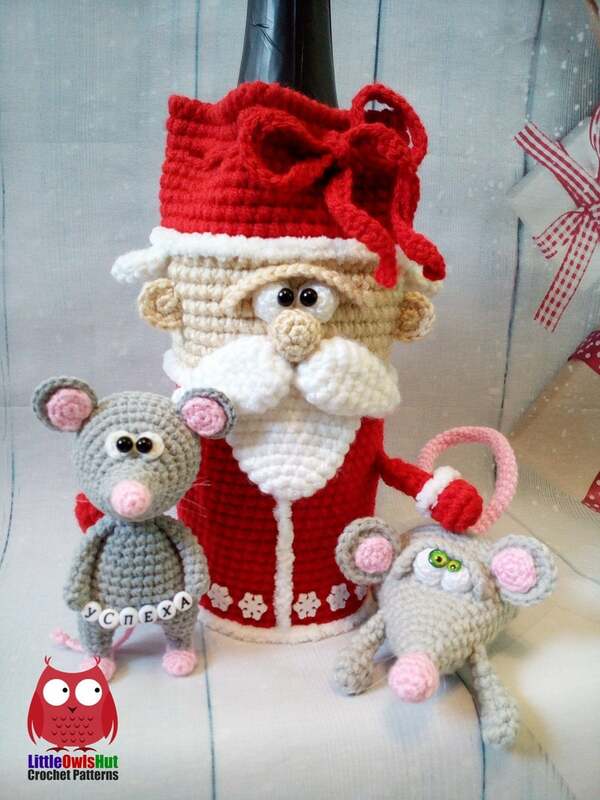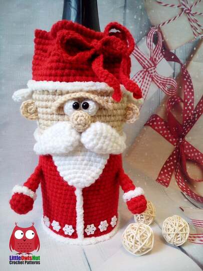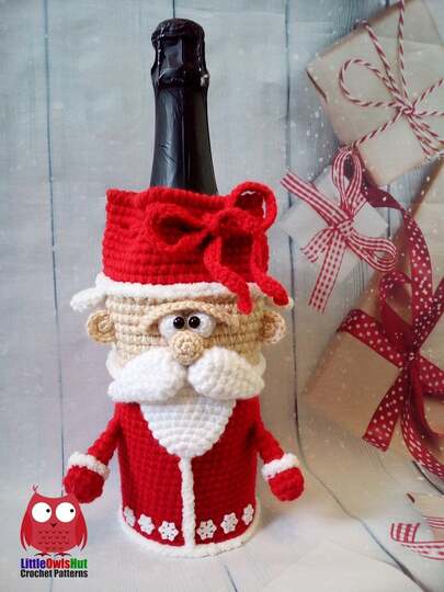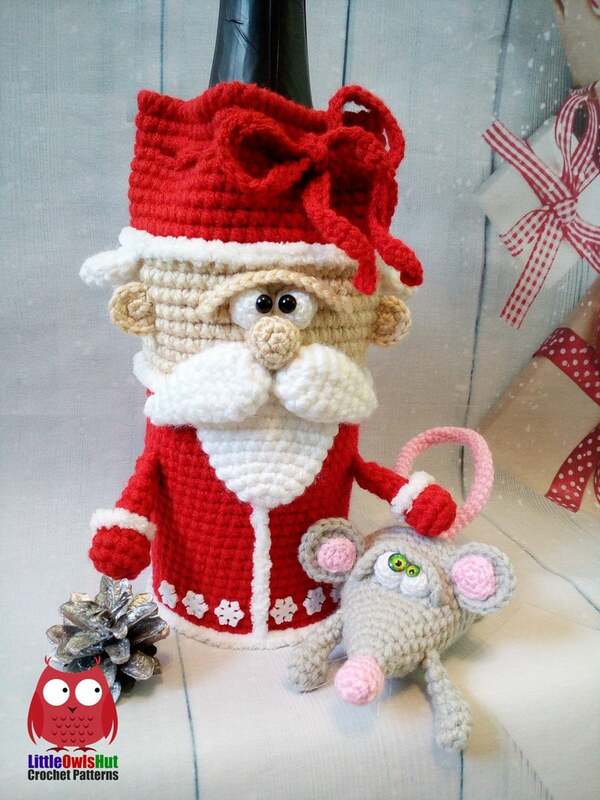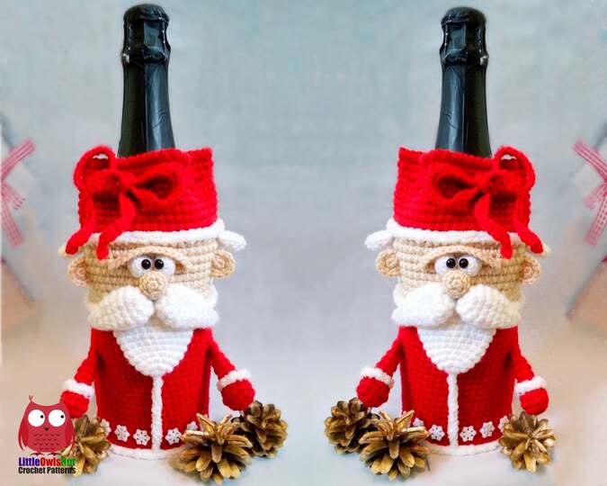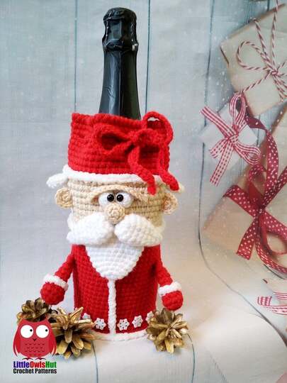 22 cm (9 inches) tall and fits standard size wine or a champagne bottle, if made using materials mentioned in the pattern.