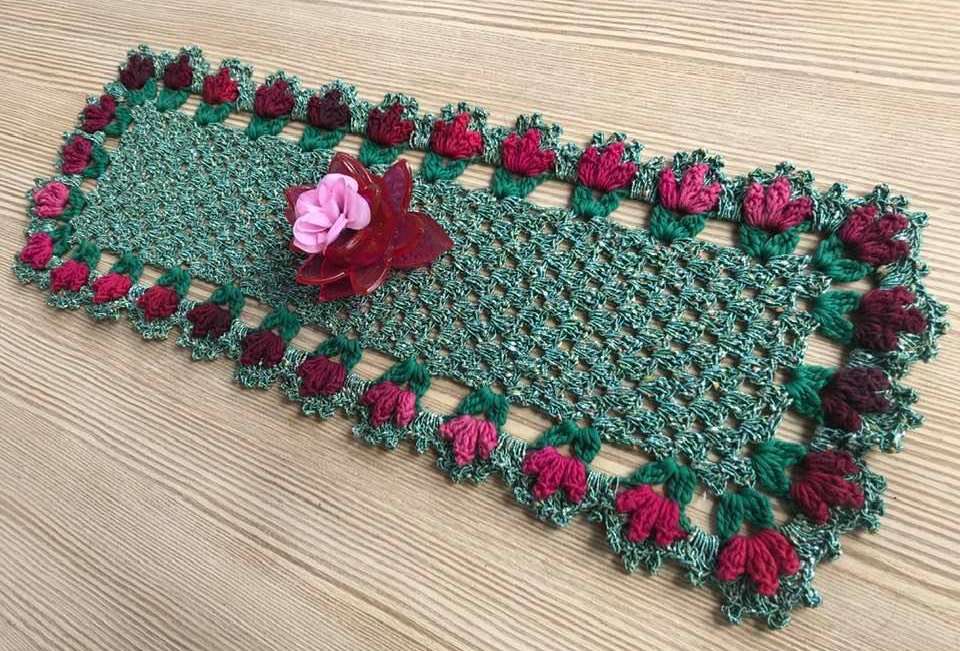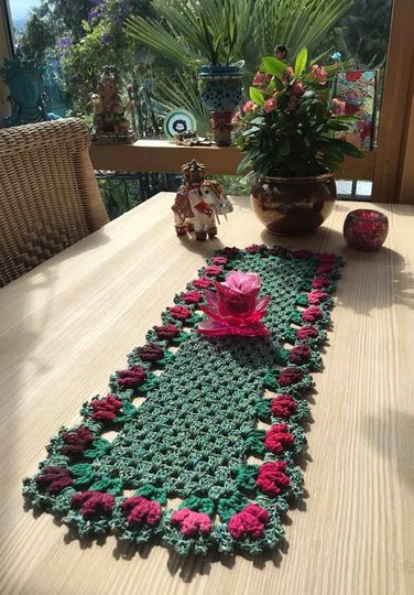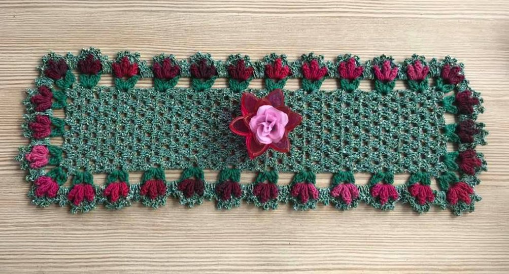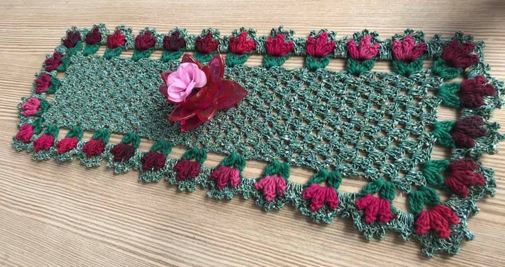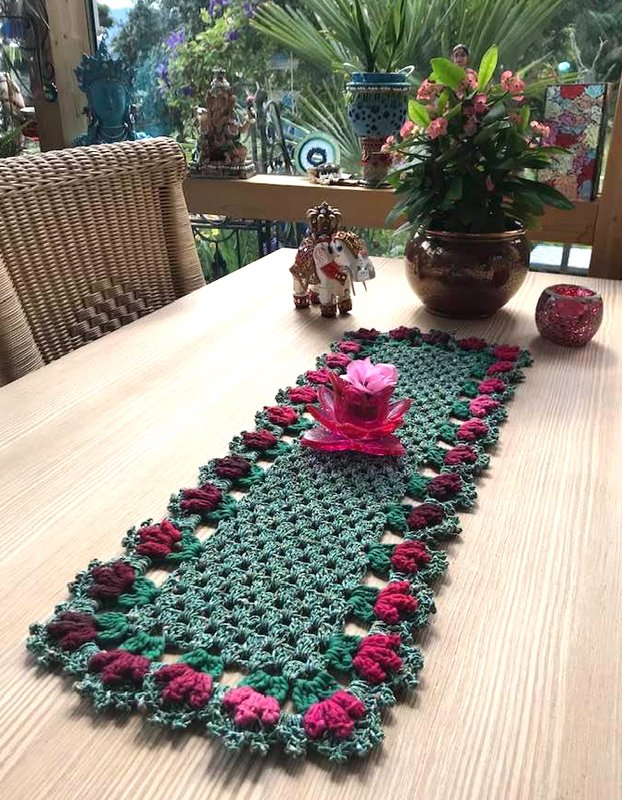 Der Tischläufer "Blütenhain" ist (bei dieser Wollestärke und ich häkele aber auch sehr locker) fertig 25cm breit + 78cm lang