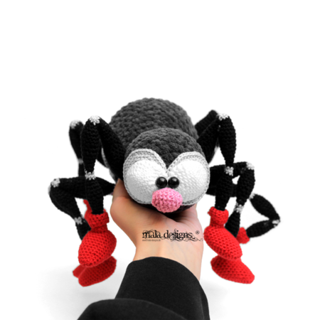 This crochet pattern contains the description for three different pumpkins and the spider. After finishing, the spider will be approx. 25cm x 23cm x 15 cm (LxWxH).