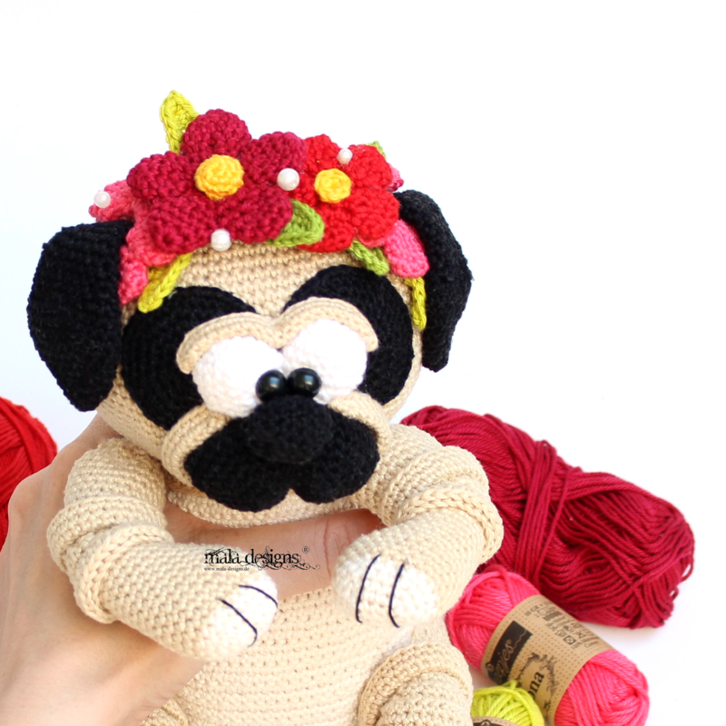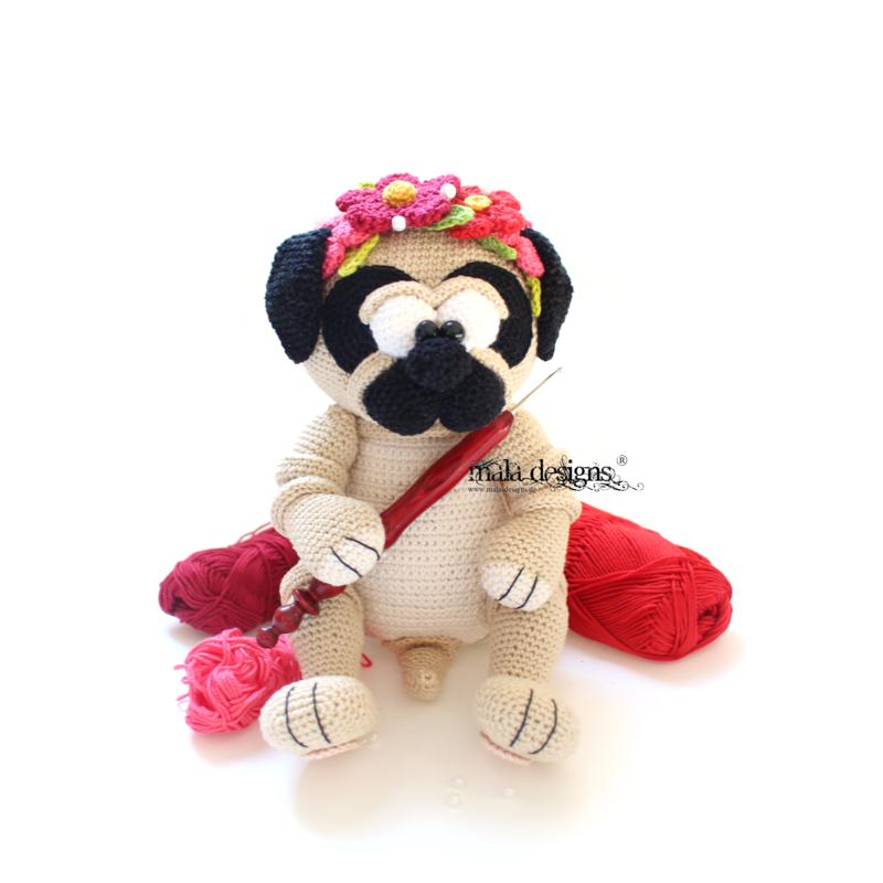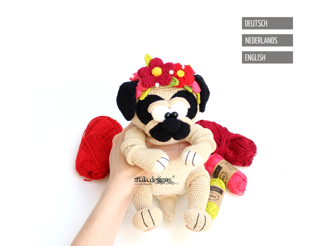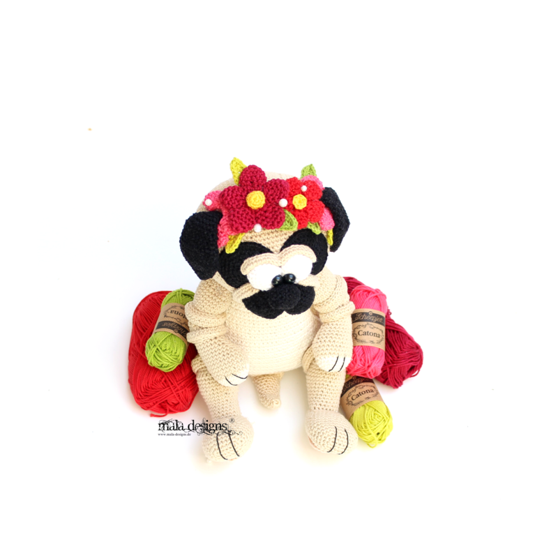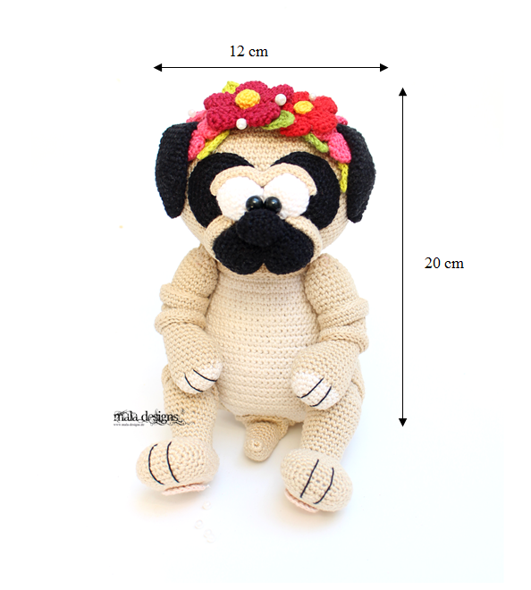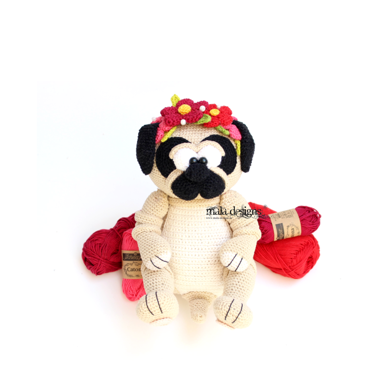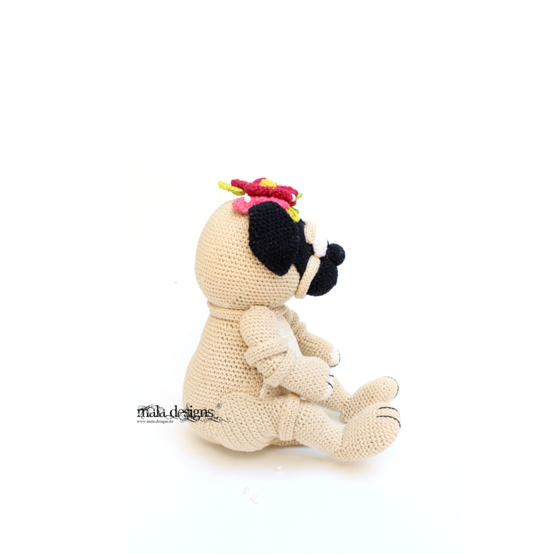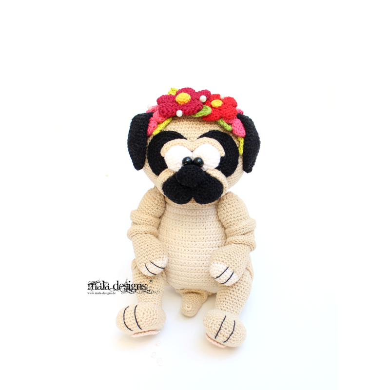 Diese Häkelanleitung beinhaltet die Beschreibung für den abgebildeten Mops mit Blumenkranz. Nach Fertigstellung wird der Mops ca.20cm x 12cm x 18 cm (HxBxT) groß.