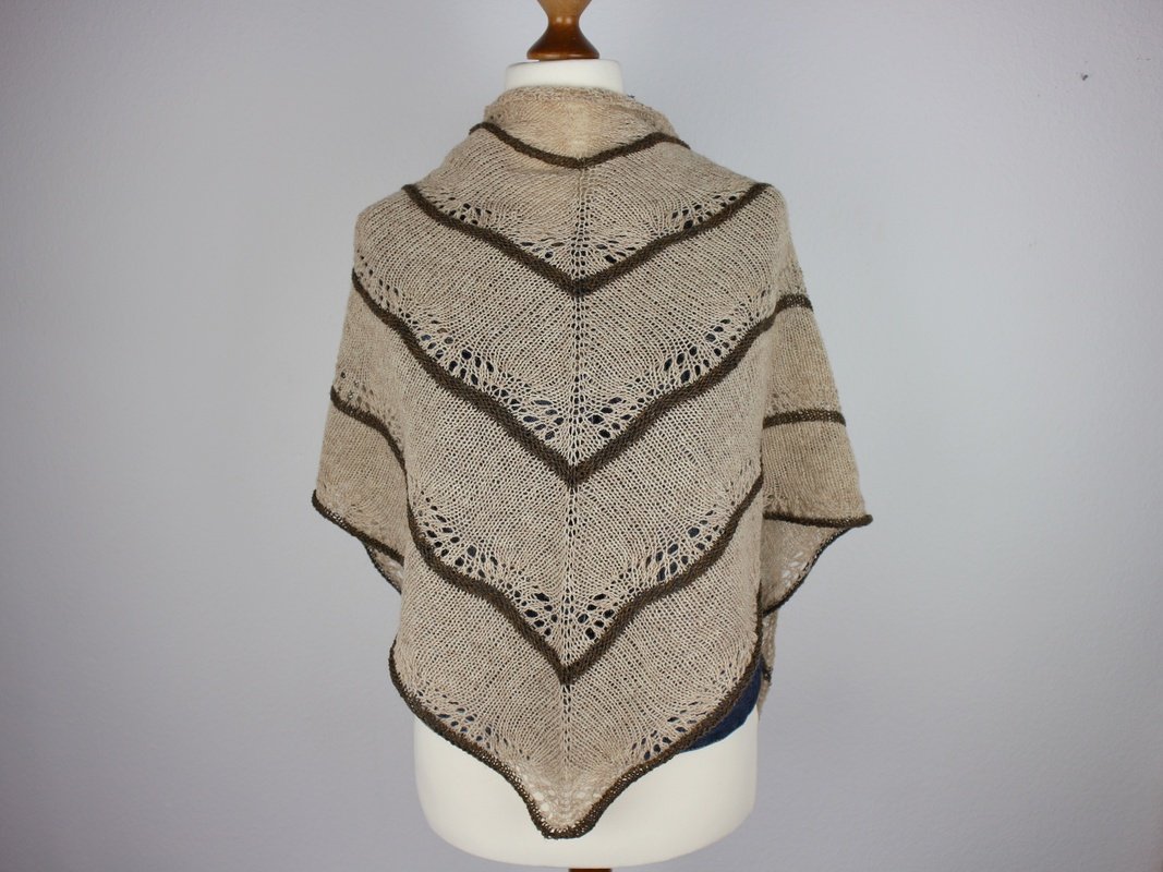 "Nature" ist ein klassisches Dreieckstuch mit feinen Muster - und Farbakzenten. Ich habe das Tuch einmal mit zwei Farben aus Naturtönen gestrickt und einmal habe ich eine helle Hauptfarbe gewählt und die Kontraststreifen mit Wollresten gearbeitet.