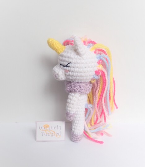I used: Red Heart Super Saver (White, lavender, bright yellow, & various 12” scrap of yarn for mane and tail)