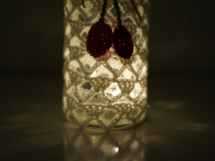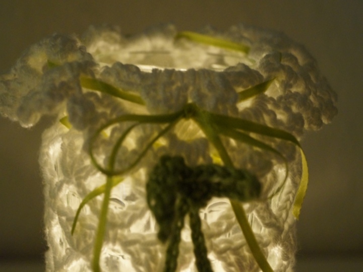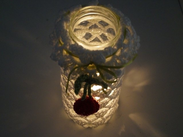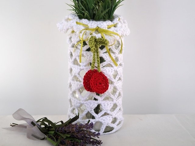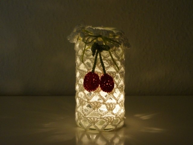 Grundkenntnisse im Häkeln sollten vorhanden sein, die Häkelschrift und die Borte am Rand des Glases wird ausführlich erklärt.