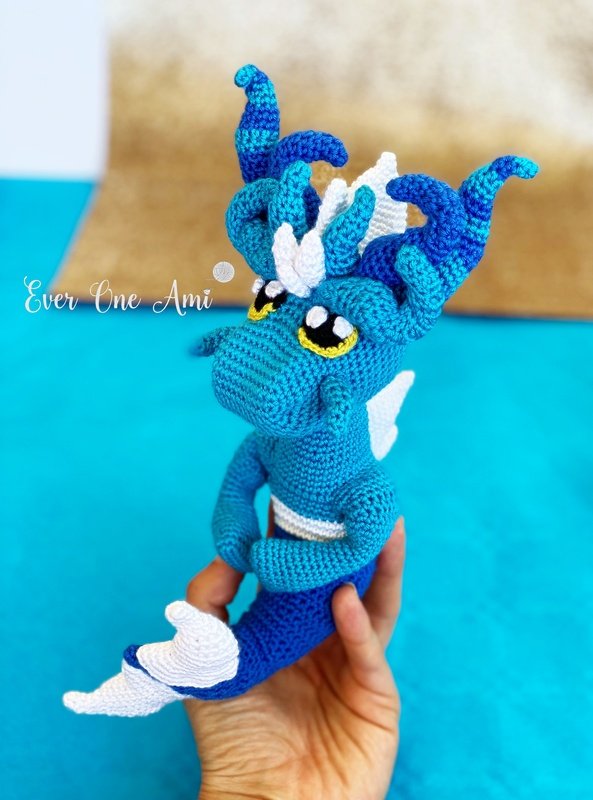 Finished Dragon size: 28 cm in height (11“), 11 cm in width (4,3“), if using the pointed yarn. It works well in any type of thread, the size of finished toy depends on the yarn and crochet hook you use.