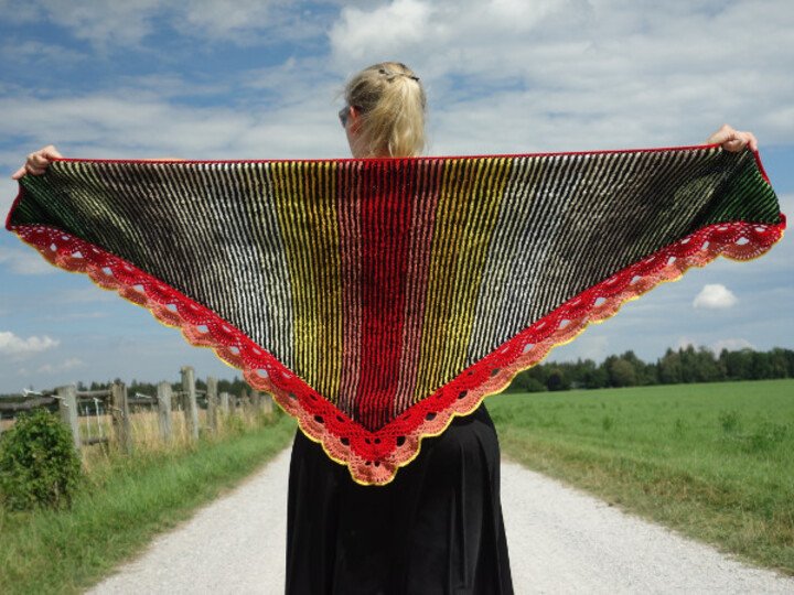 Dieses Dreieckstuch ist in der Technik Illusionsstricken gearbeitet.