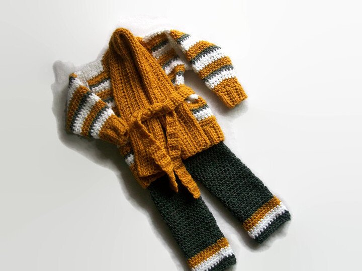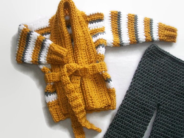 This cardigan sweater with tie and cute little pants, is super easy to make, stylish and perfect for the cooler months. The pattern is written in US terminology. Easy stitches and super fun and quick to make.
